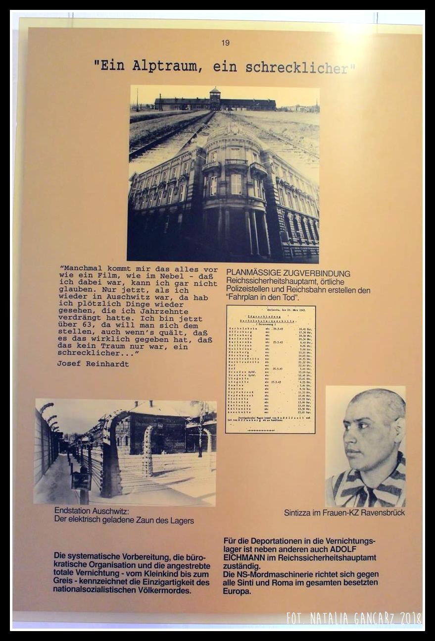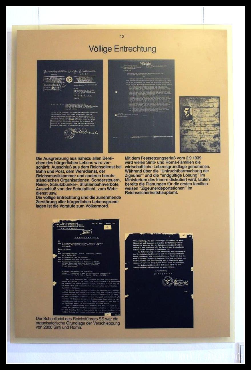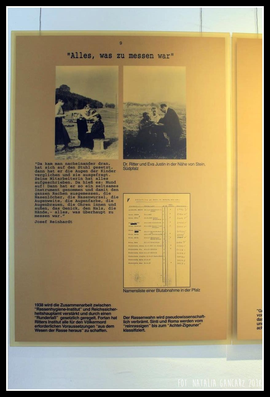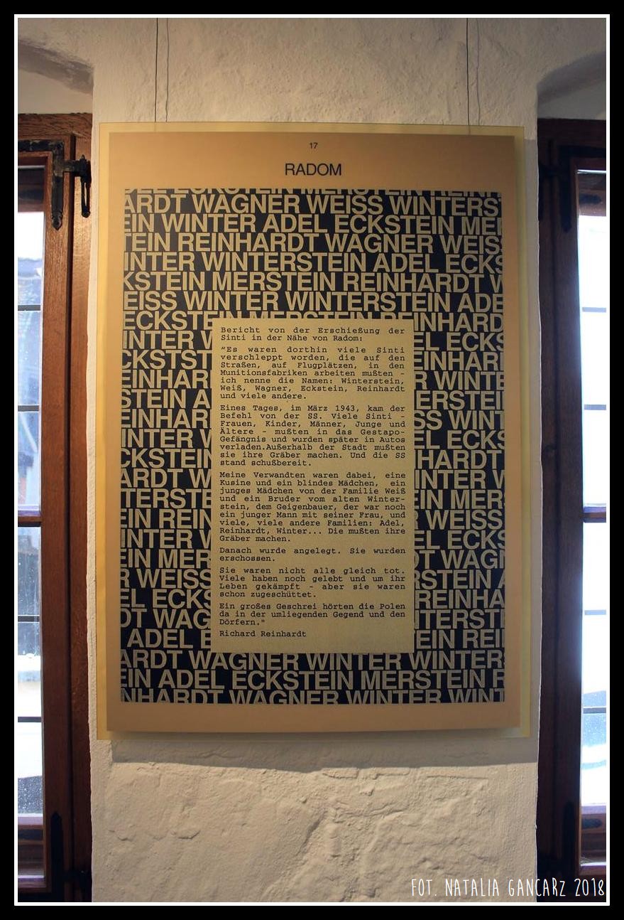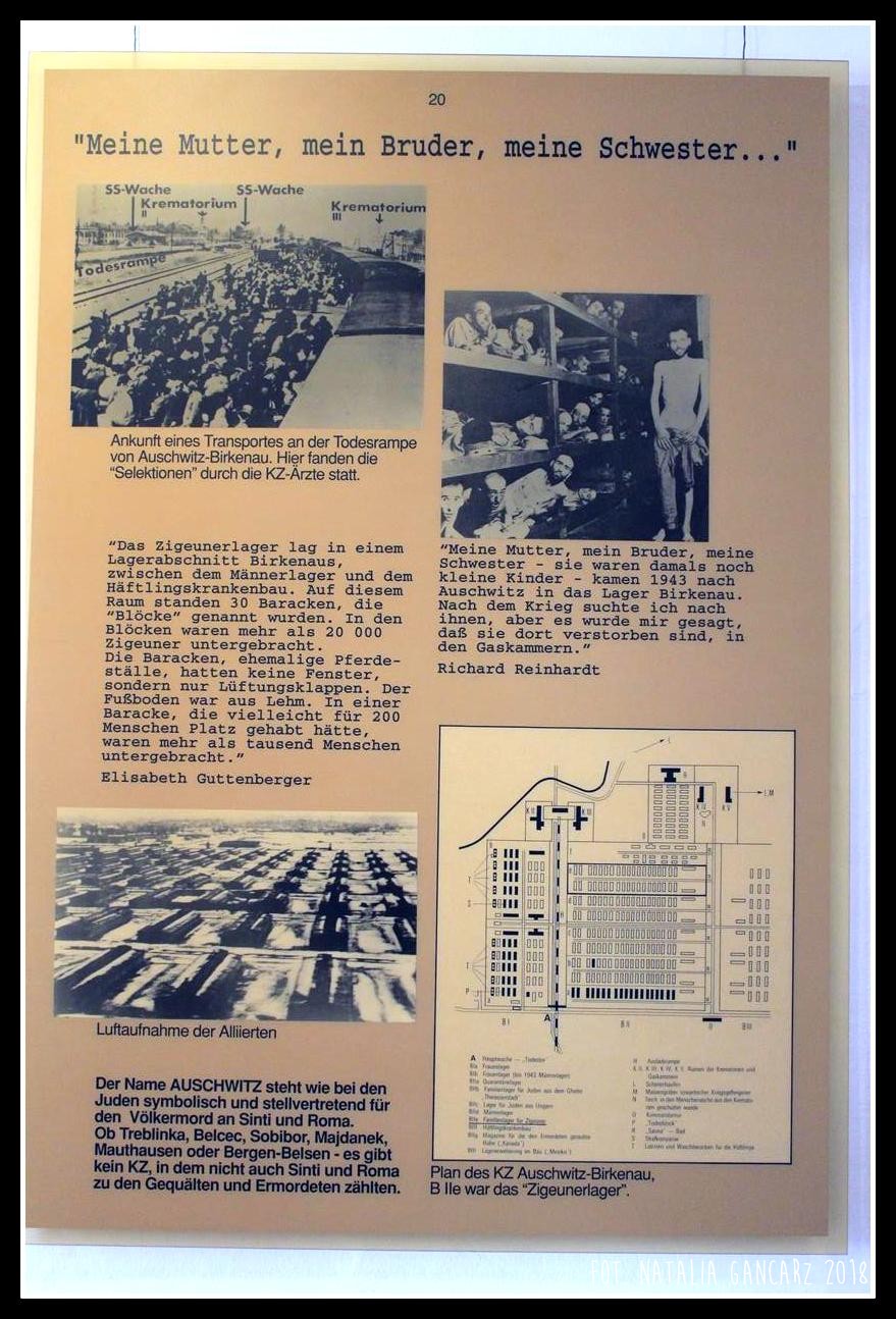 Wystawa dotycząca Sintów i Romów w rejonie Nadrenii-Palatynatu składa się z 24 plansz w języku niemieckim. Przedstawia postaci ocalonych, początki ruchu cygańskiego, związanego z z wiedzą i upamiętnianiem Zagłady Cyganów, oraz historię Sintów z Landau i rejonu, począwszy od roku 1933, poprzez późniejsze badania antropologiczne, wojenne dzieje wybranych rodzin, przypadek dzieci z przedszkola w Mulfingen, KL Auschwitz i śmierć.