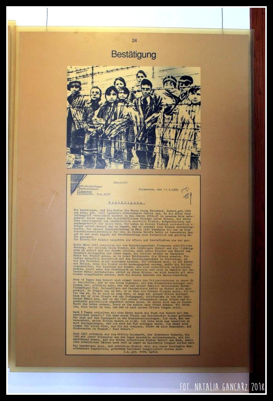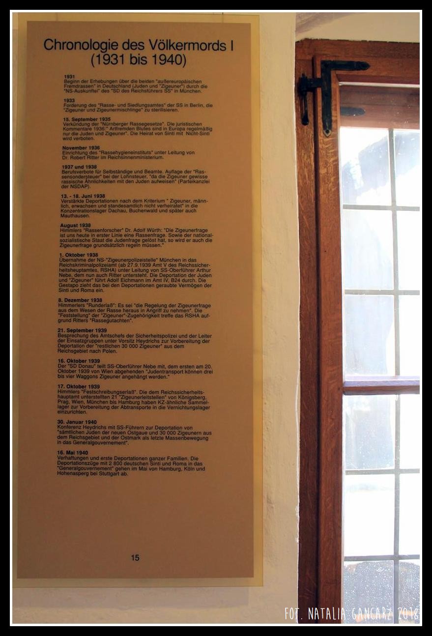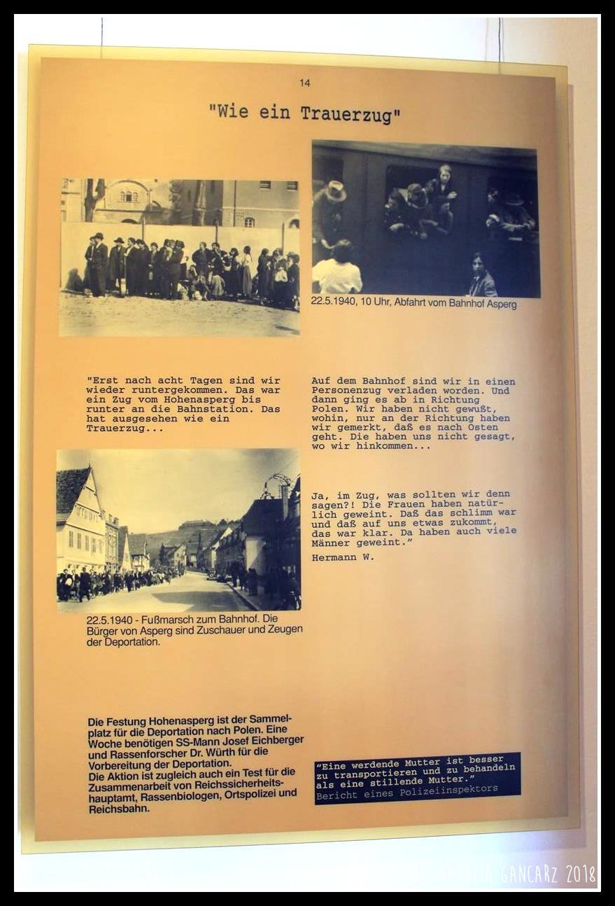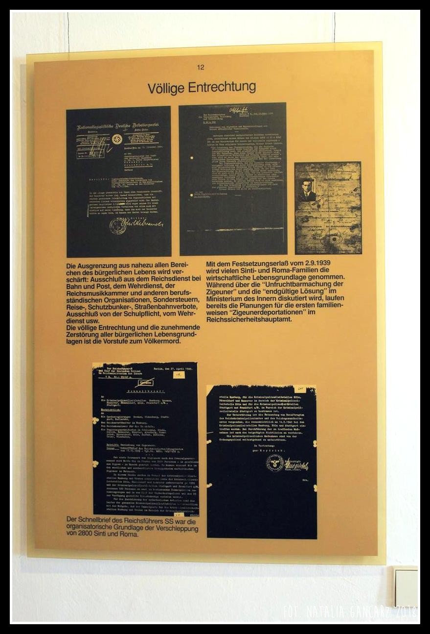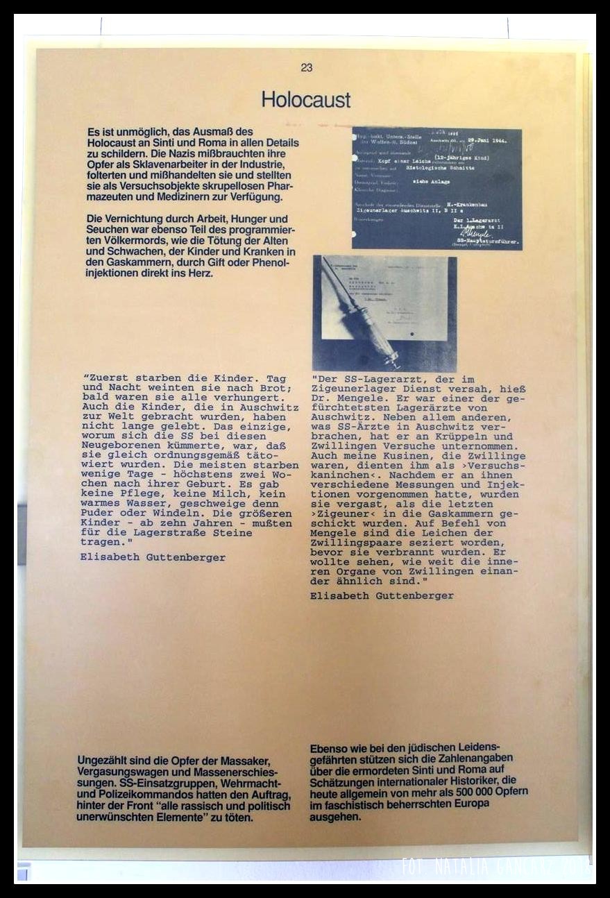Wystawa dotycząca Sintów i Romów w rejonie Nadrenii-Palatynatu składa się z 24 plansz w języku niemieckim. Przedstawia postaci ocalonych, początki ruchu cygańskiego, związanego z z wiedzą i upamiętnianiem Zagłady Cyganów, oraz historię Sintów z Landau i rejonu, począwszy od roku 1933, poprzez późniejsze badania antropologiczne, wojenne dzieje wybranych rodzin, przypadek dzieci z przedszkola w Mulfingen, KL Auschwitz i śmierć.