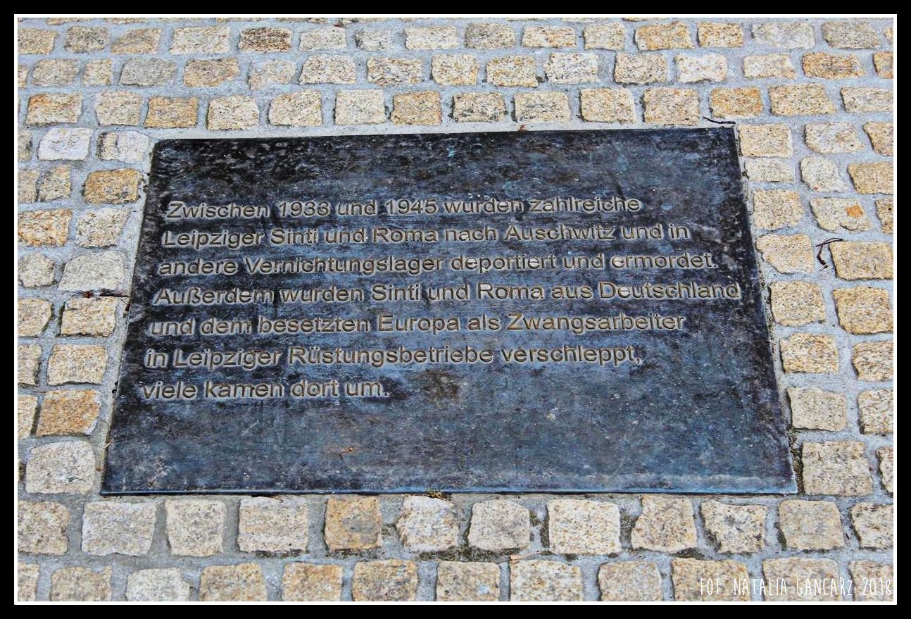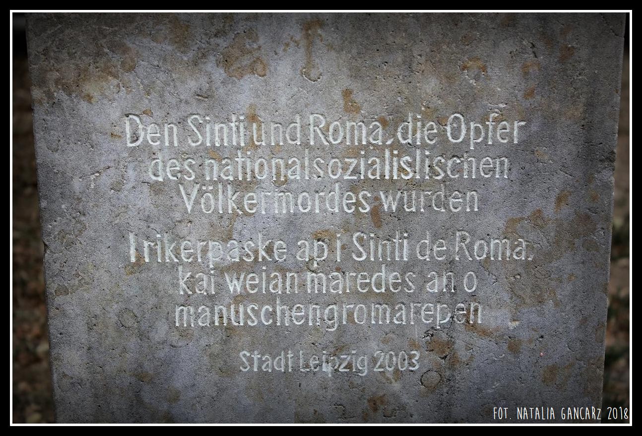 Den Sinti und Roma, die Opfer / des nationalistischen / Völkermordes wurden. [niem. – przyp. NG] // I rikerpaske ap i Sinti de Roma, / kei weian maredes an o / manuschengromarepen. [rom. – przyp. NG] // Stadt Leipzig 2003