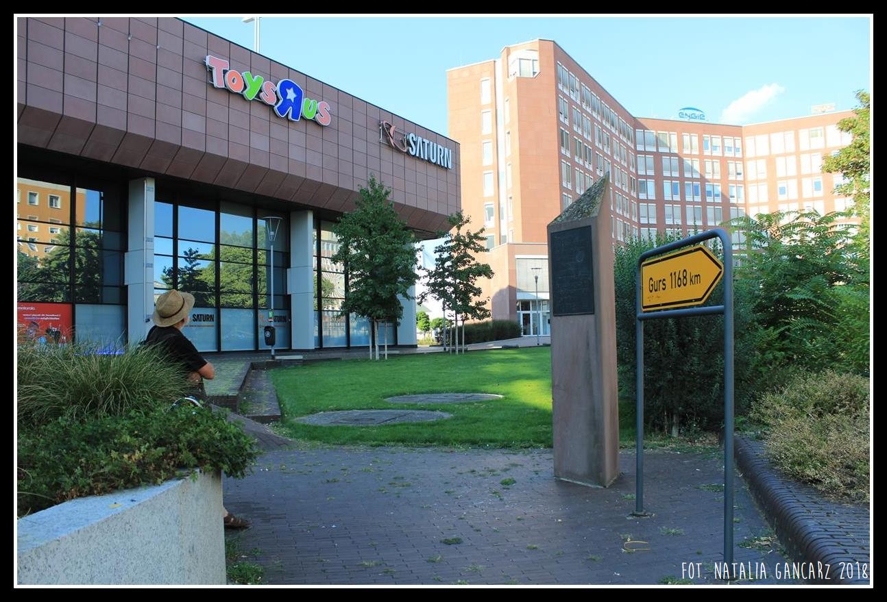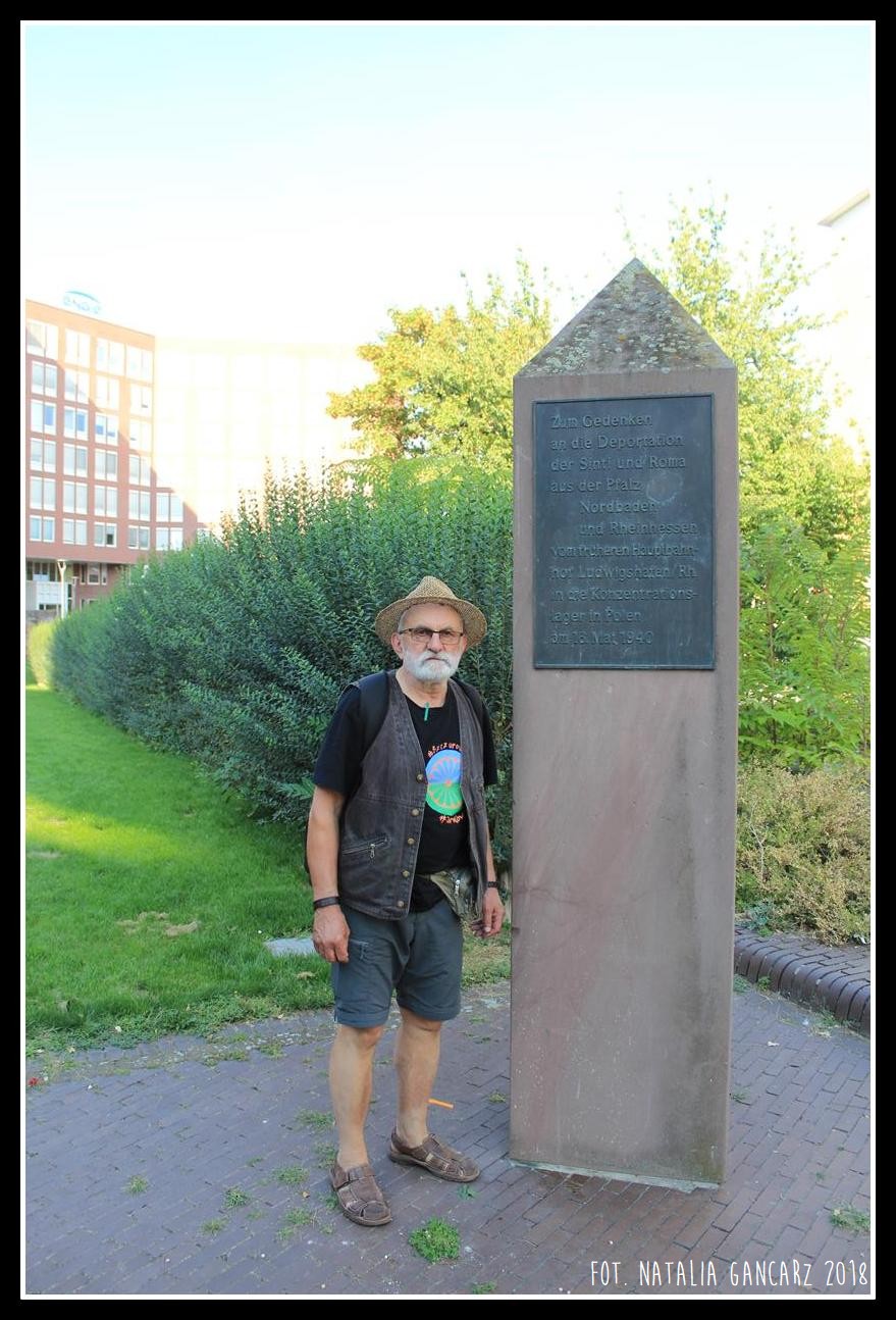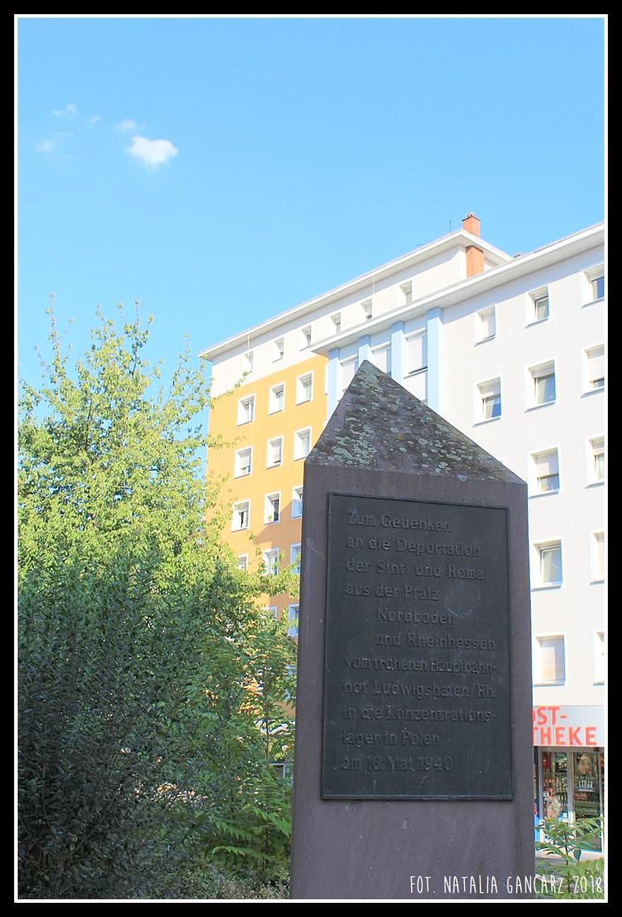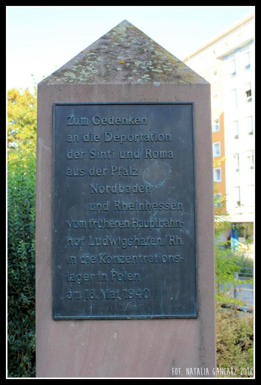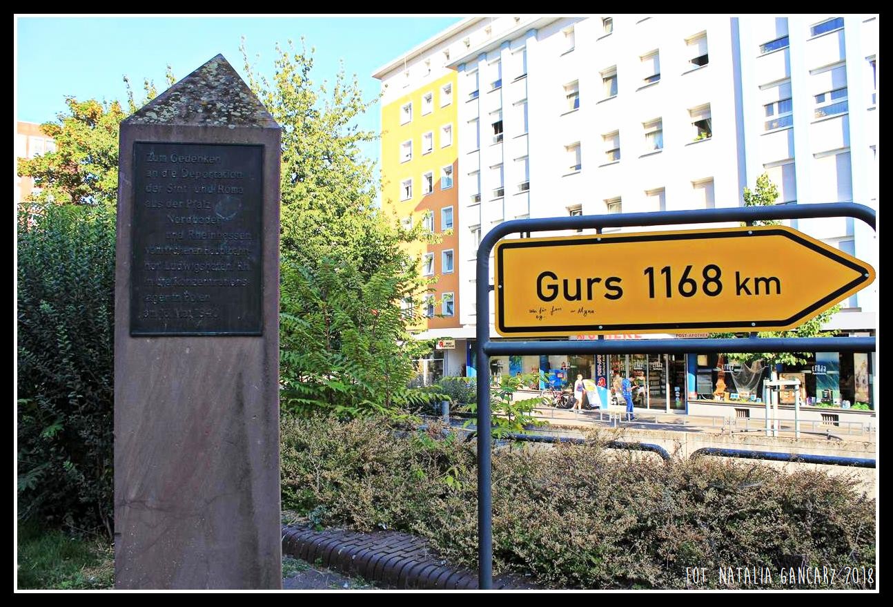 Po prawej stronie od pomnika zamontowano dodatkowo znak drogowy, kierujący do południowo-francuskiego Gurs („Gurs 1168 km”), gdzie znajdował się obóz internowania Cyganów, z czego można wnosić, iż nie wyłącznie do obozów koncentracyjnych na terenie Polski, ale i Francji – wywożono Cyganów z Ludwigshafen. Nie znalazłam jednak żadnych szczegółów na ten temat.
