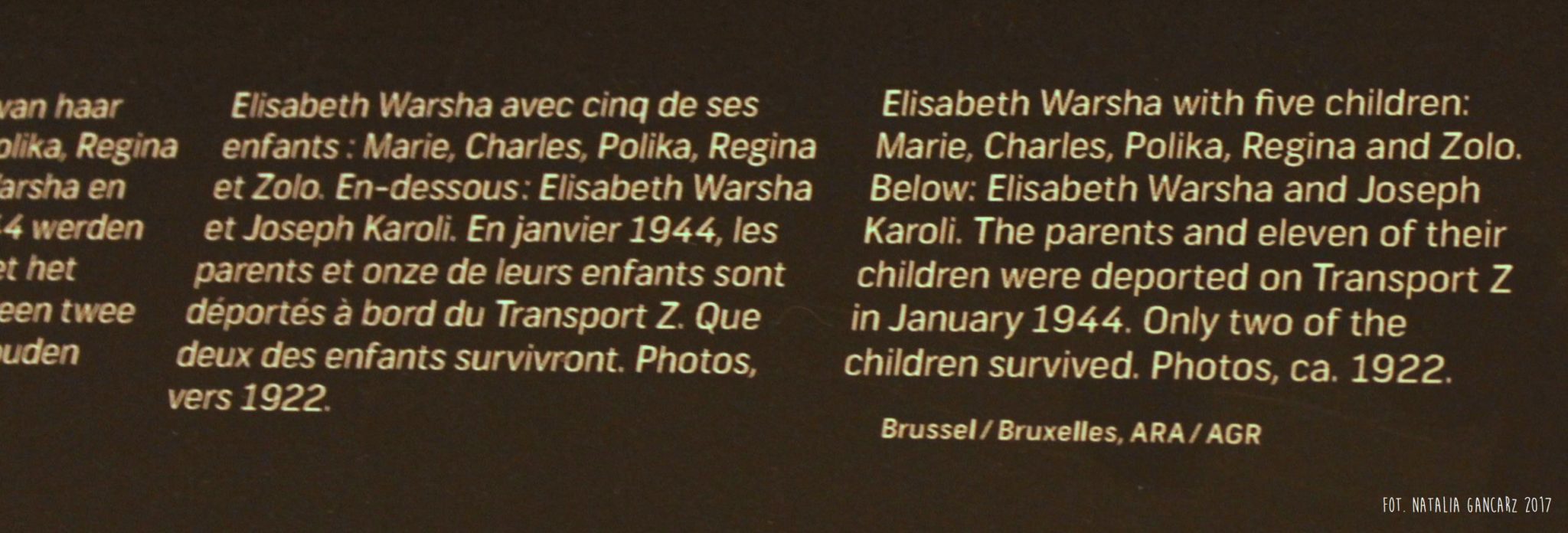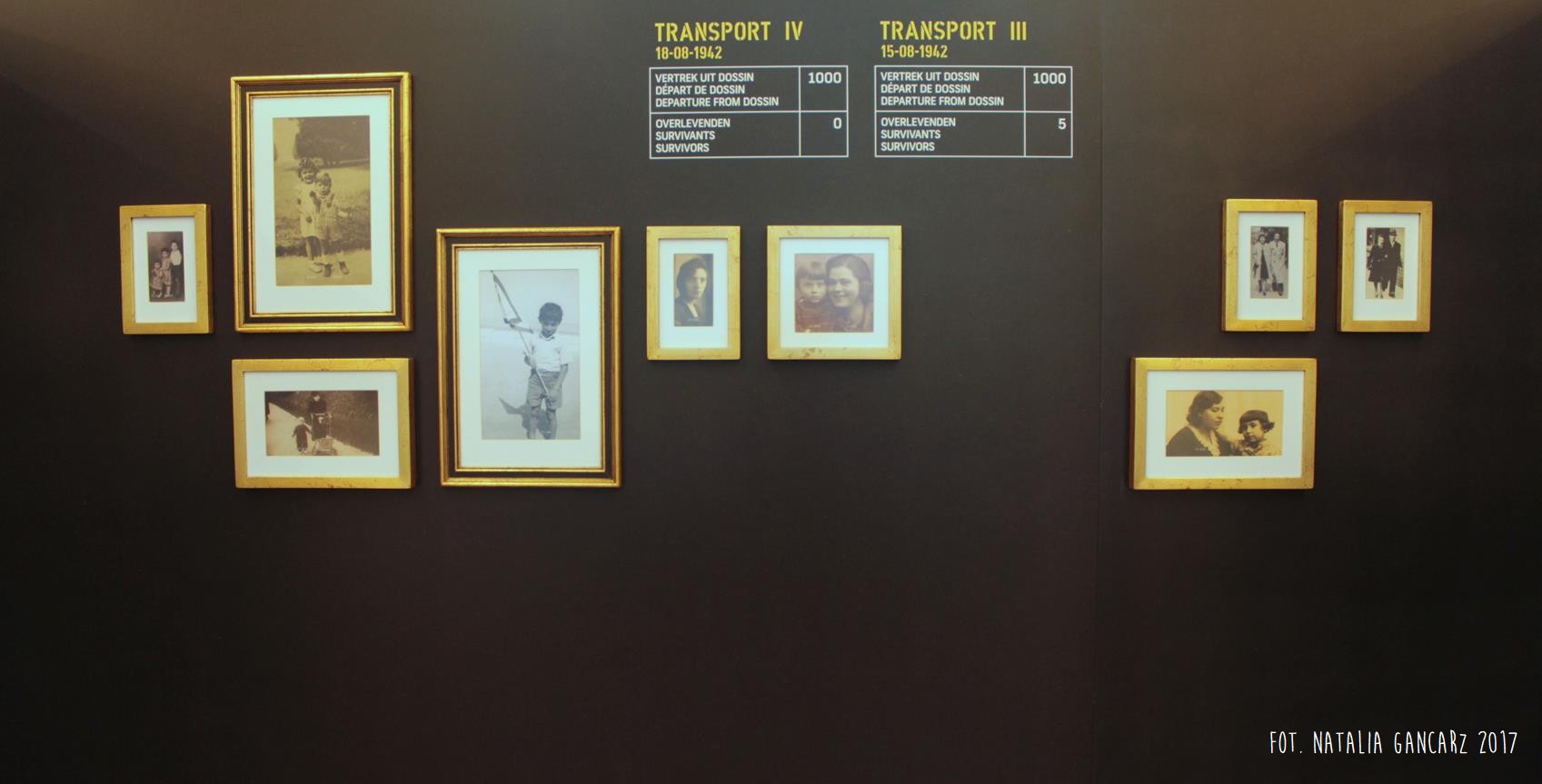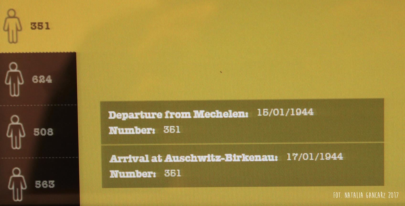 Część memorialna, należąca do kompleksu dawnego obozu Kazerne Dossin (ta, której nie mogliśmy obejrzeć), podobnie jak wystawa – koncentruje się wokół trzech zagadnień. Tym razem są to: ślady, imiona i twarze. W poszczególnych salach prezentowane są zatem ślady – pamiątki po więźniach, nazwiska – z list deportacyjnych oraz twarze – pokazane na 28 ekranach fotografie portretowe wraz z nazwiskami i numerami transportu.