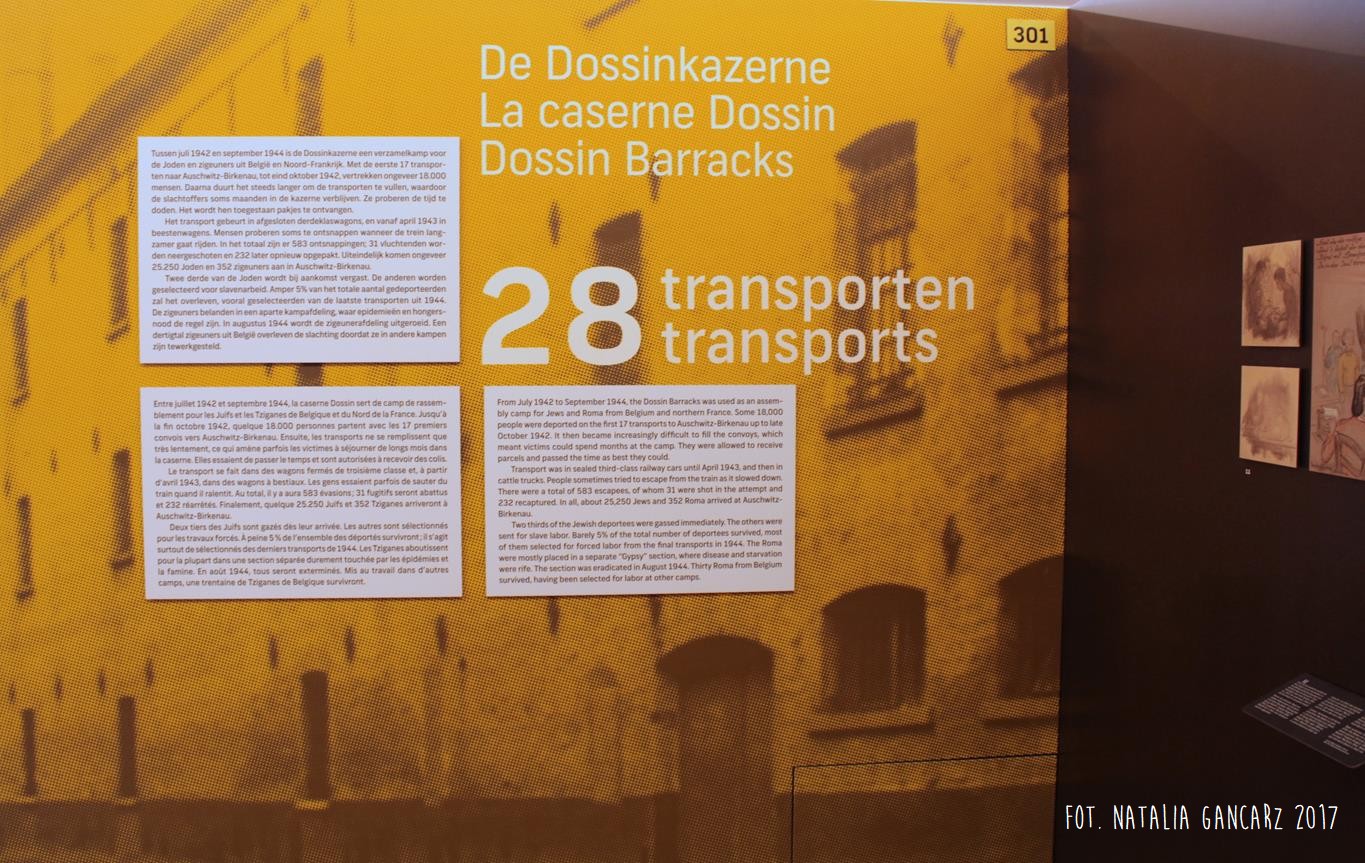 Ogólna koncepcja Miejsca Pamięci Kazerne Dossin zakłada istnienie pomnika (a raczej – upamiętnienia) – mieszczącego się w części zabudowań koszarowych (niestety podczas naszej wyprawy był on remontowany i nieczynny dla zwiedzających), wystawy, która poza tematyką historyczną odnosi się mocno do realiów świata współczesnego i zbudowana jest wokół trzech pojęć: „masy” (tj. ludzie jako masy), „strach”, „śmierć” – oraz projektu „Give them a face” (‘Oddać im twarze’), który ma pełnić podobną rolę, co bezustanne czytanie nazwisk ofiar obozu Westerbork w Niderlandach. Pamięci, która jest mocniejsza od najtrwalszej nienawiści i próby unicestwienia człowieka do cna.