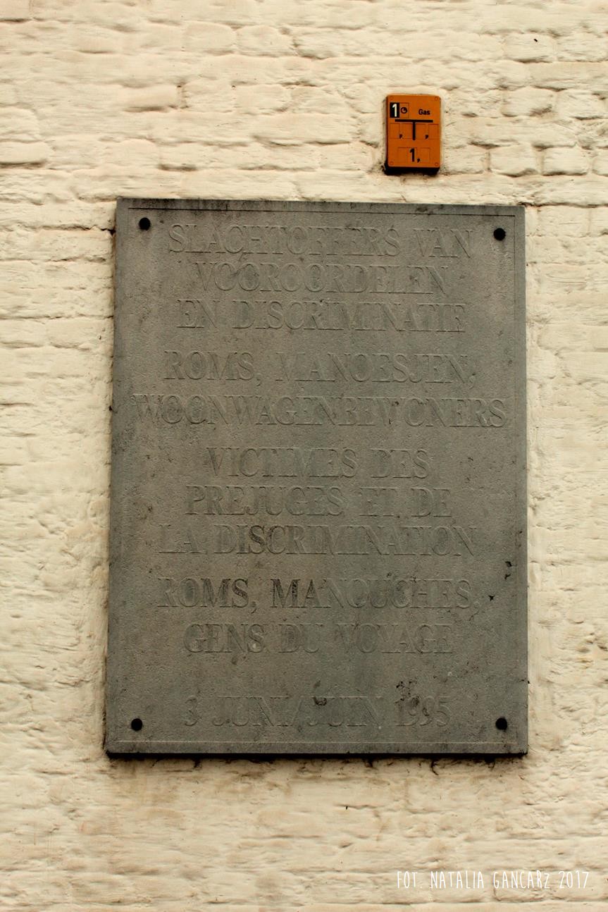 Tablica poświęcona Cyganom to prosta kamienna płyta, na której napis w języku niderlandzkim i francuskim wykonany jest w prostym kroju czcionki szeryfowej, wersalikami, wypukłymi w stosunku do tła tablicy.