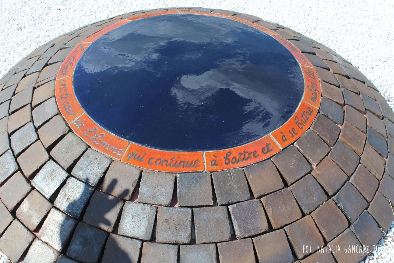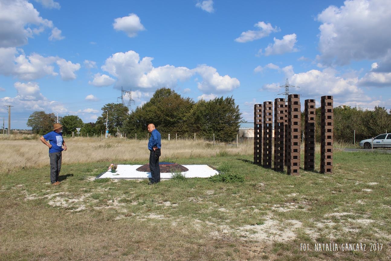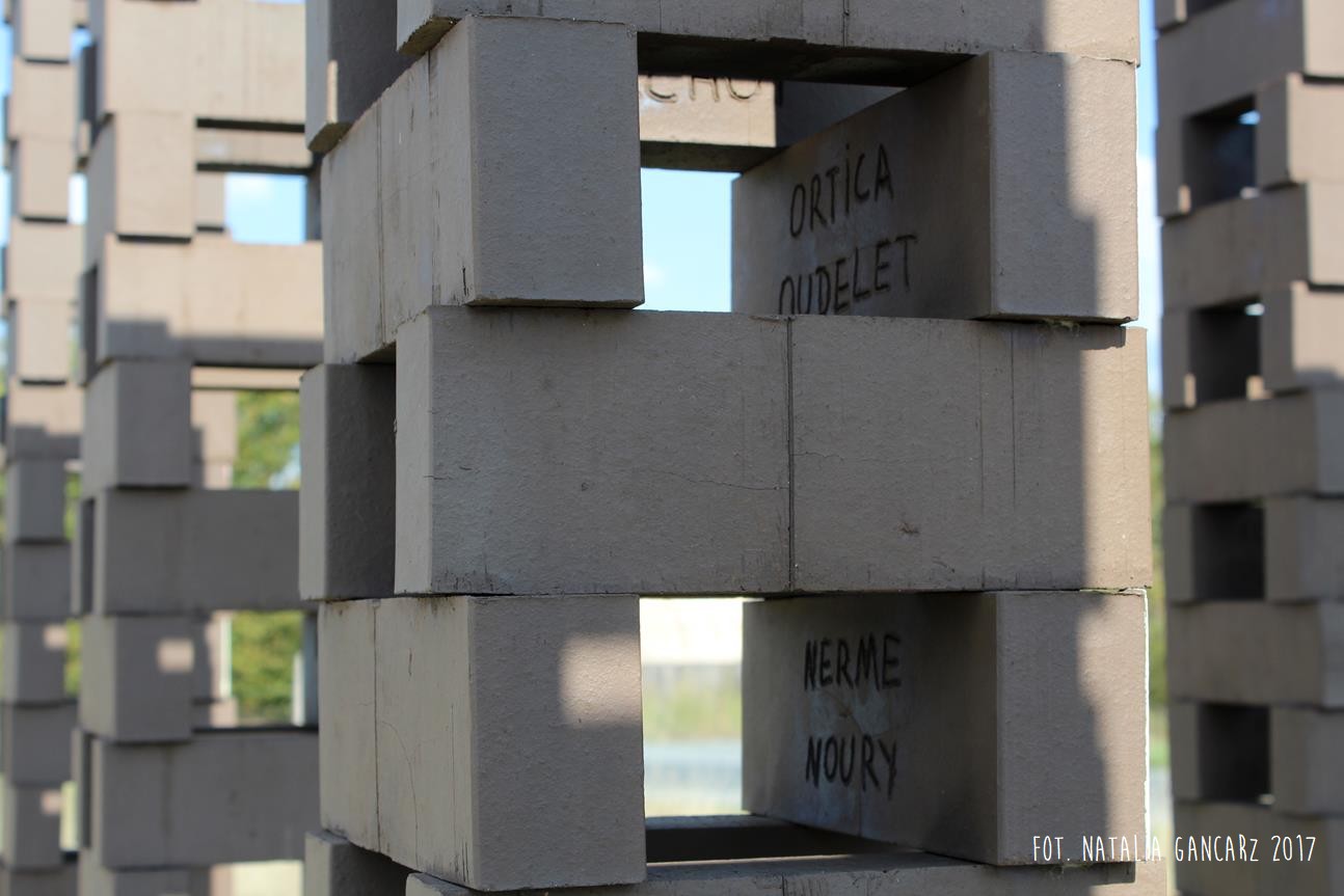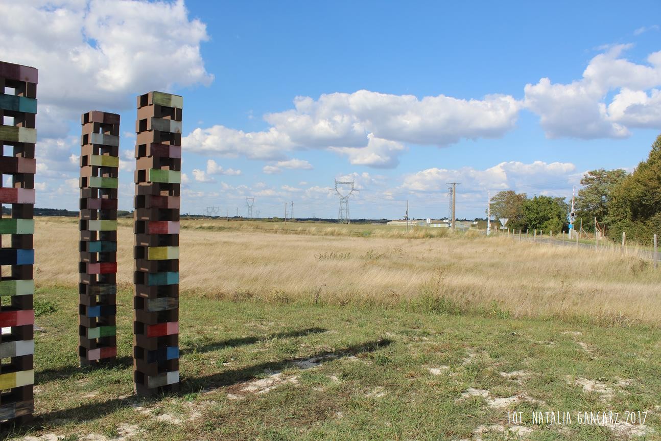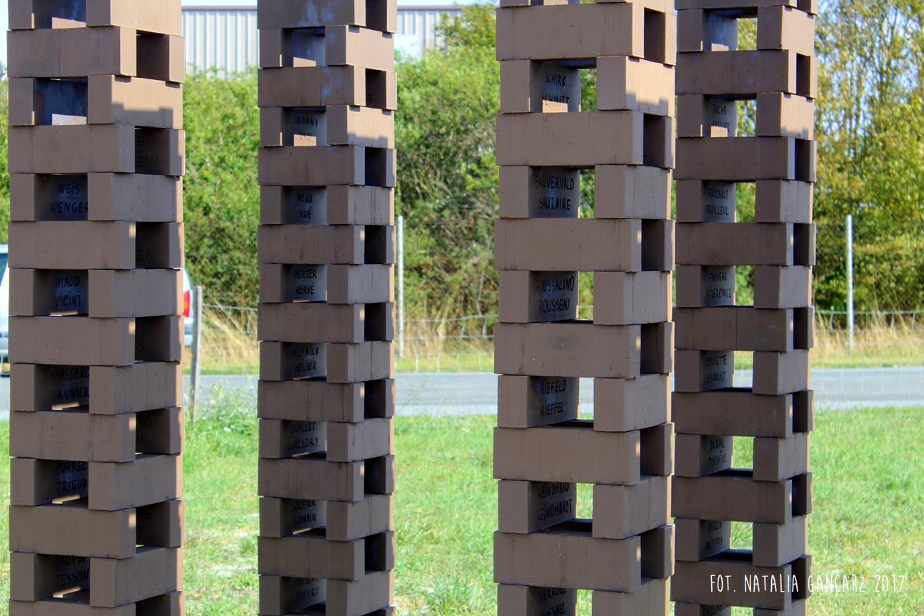 Drugi w kolejności powstania pomnik jest instalacją, składającą się z ośmiu słupów, przypominających kominy o jednakowej wysokości ok. 2,70 m. Kominy wykonane są z luźno położonych na sobie cegłach (ułożone na wozówkach, opierają się na sobie na wysokości główek). Na cegłach do wysokości wzroku – od wewnętrznej strony wycięto nazwiska 473 więźniów obozu. Od strony drogi na Méron cegły pokryte są różnokolorową farbą. Po przeciwnej stronie, czyli tam, gdzie ciągnie się teren dawnego obozu – artystka zbudowała z główek cegieł konstrukcję przypominającą pół kuli ziemskiej (właściwie wygląda ona jak plaster kuli ziemskiej odcięty wraz z biegunem mniej więcej na wysokości zwrotnika). Wystaje ona z kwadratowej powierzchni wysypanej białymi drobnymi kamieniami – niczym oko. Szczyt tego plastra kuli ziemskiej pokryty jest niebieskim szkliwem, w którym odbijają się chmury. Wokół lustrzanej niebieskiej powłoki – glazurowany na pomarańczowo otok z wygiętych łukowato cegieł – na ich wozówce autorka wycięła i pobrązowiła odręczny napis w jęz. francuskim.