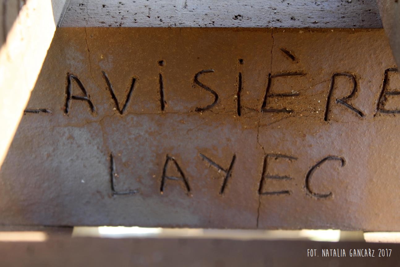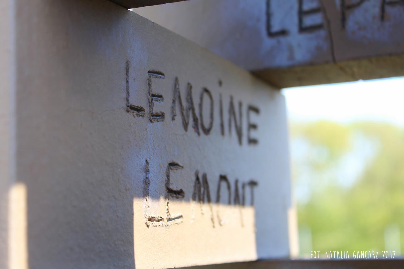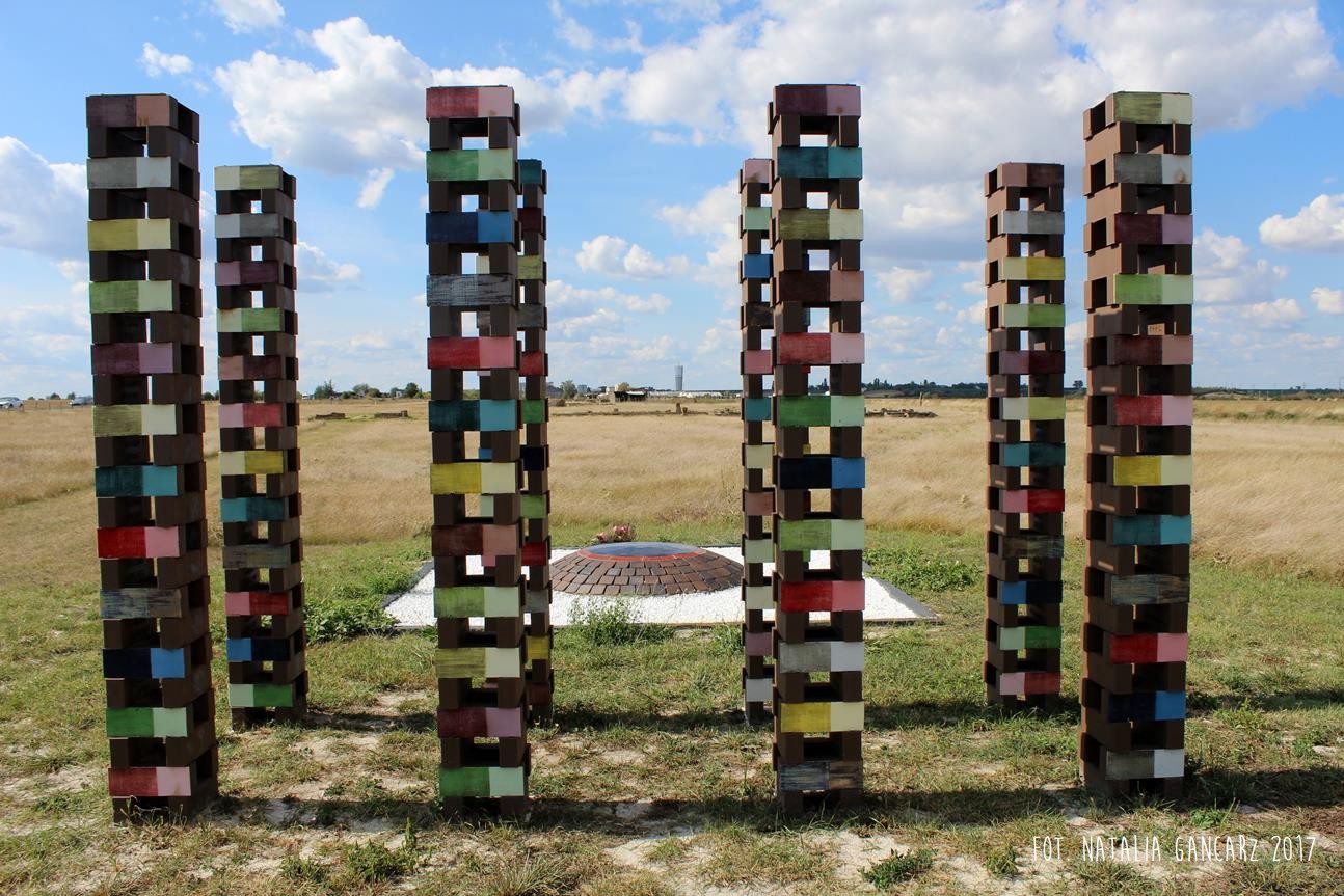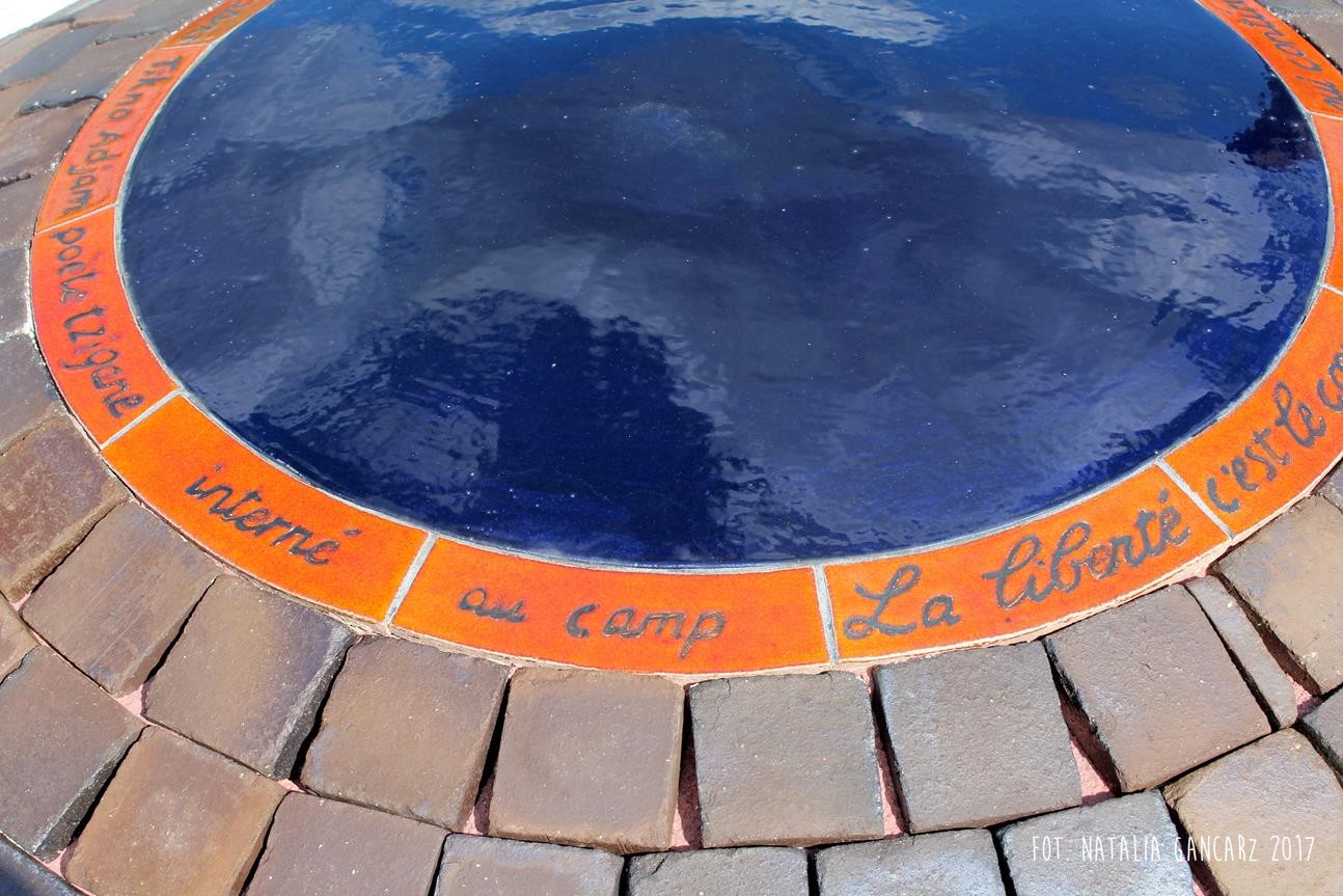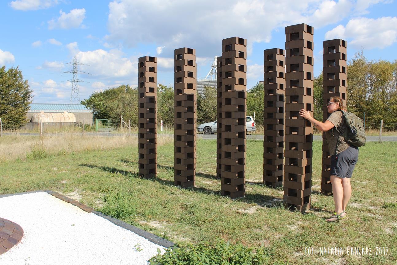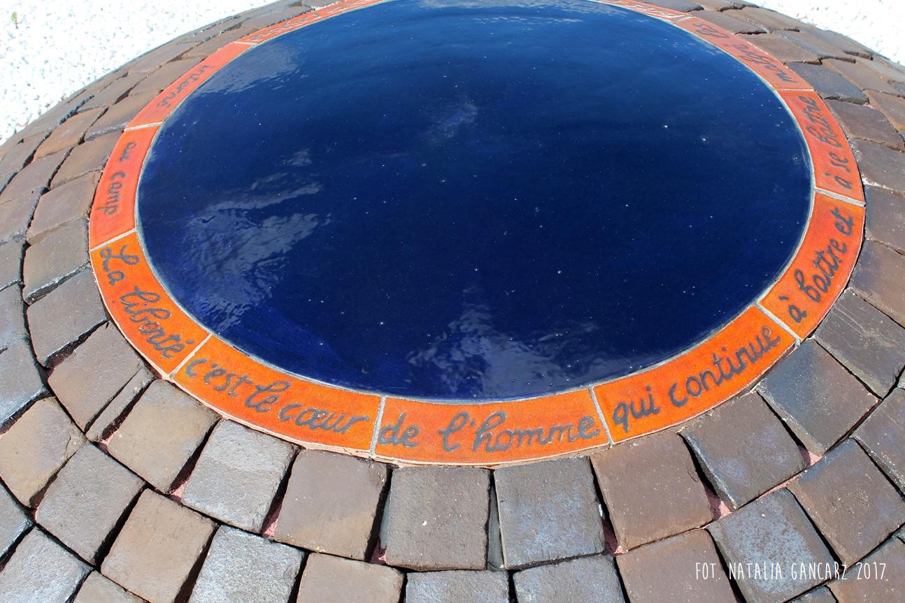 Drugi w kolejności powstania pomnik jest instalacją, składającą się z ośmiu słupów, przypominających kominy o jednakowej wysokości ok. 2,70 m. Kominy wykonane są z luźno położonych na sobie cegłach (ułożone na wozówkach, opierają się na sobie na wysokości główek). Na cegłach do wysokości wzroku – od wewnętrznej strony wycięto nazwiska 473 więźniów obozu. Od strony drogi na Méron cegły pokryte są różnokolorową farbą. Po przeciwnej stronie, czyli tam, gdzie ciągnie się teren dawnego obozu – artystka zbudowała z główek cegieł konstrukcję przypominającą pół kuli ziemskiej (właściwie wygląda ona jak plaster kuli ziemskiej odcięty wraz z biegunem mniej więcej na wysokości zwrotnika). Wystaje ona z kwadratowej powierzchni wysypanej białymi drobnymi kamieniami – niczym oko. Szczyt tego plastra kuli ziemskiej pokryty jest niebieskim szkliwem, w którym odbijają się chmury. Wokół lustrzanej niebieskiej powłoki – glazurowany na pomarańczowo otok z wygiętych łukowato cegieł – na ich wozówce autorka wycięła i pobrązowiła odręczny napis w jęz. francuskim.