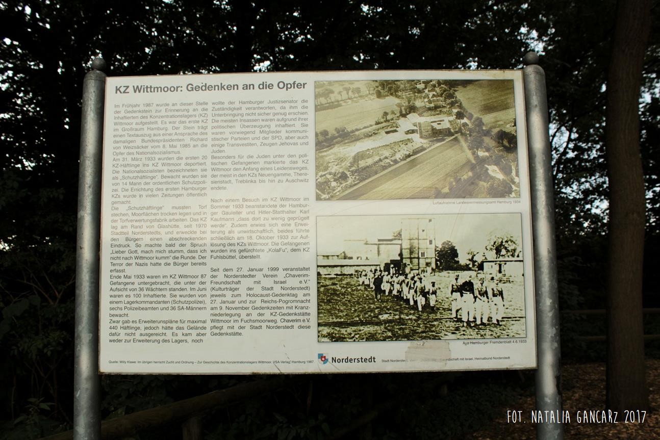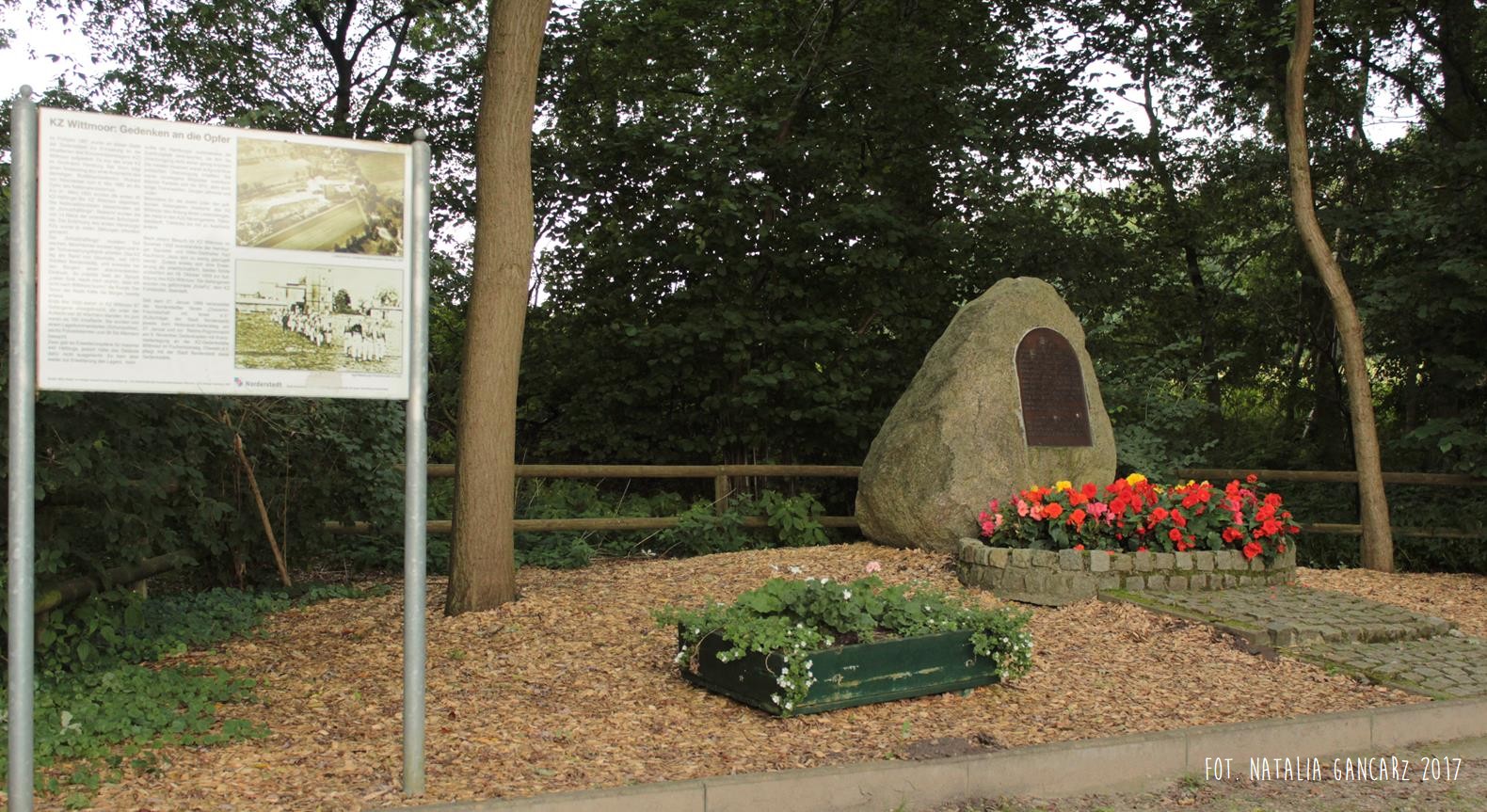 Po lewej stronie kamienia znajduje się tablica informacyjna, wyłącznie w jęz. niemieckim, zatytułowana: „KZ Wittmoor – Gedenken an die Opfer”, przedstawiająca historię tego obozu.