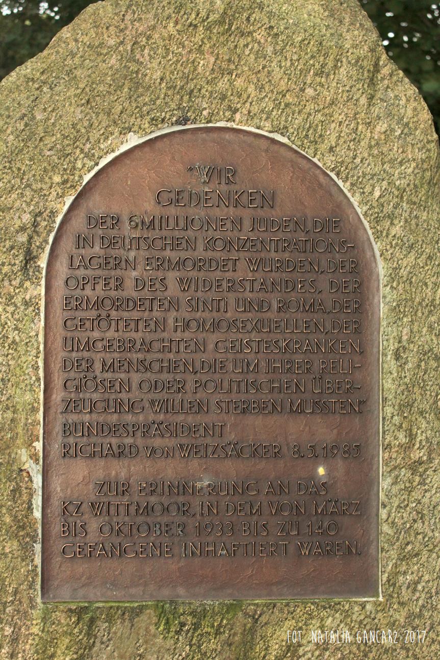Dla upamiętnienia 6 milionów Żydów, zamordowanych w niemieckich obozach koncentracyjnych, ofiar oporu, zamordowanych Sintów i Romów, homoseksualistów, chorych psychicznie, ludzi, którzy musieli zginąć za własne przekonania – polityczne i religijne. – Prezydent Niemiec, Richard von Weizsäcker, dnia 8.05.1985. Na pamiątkę obozu Wittmoor.