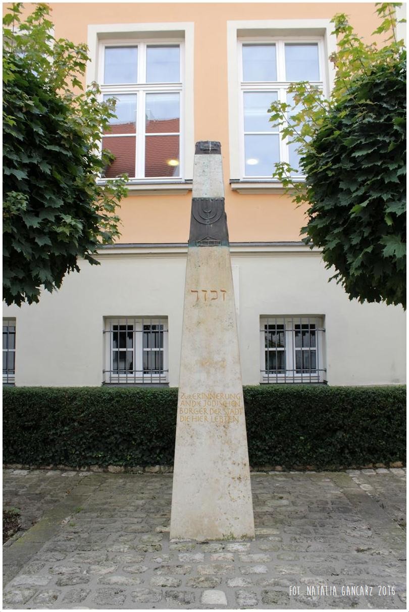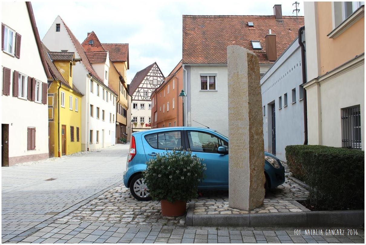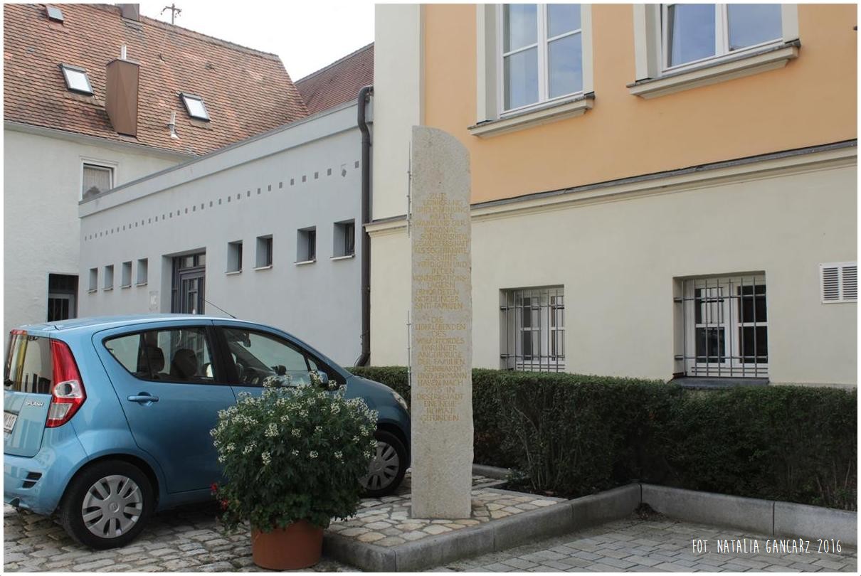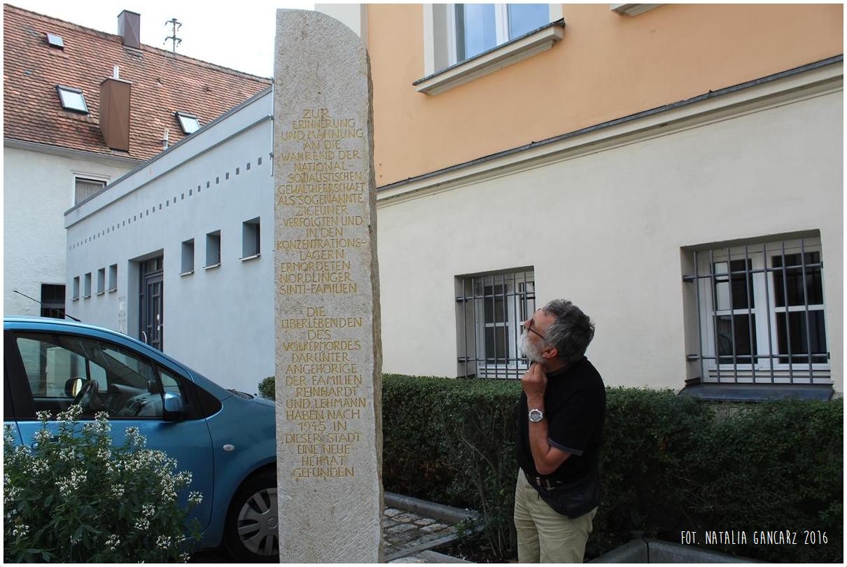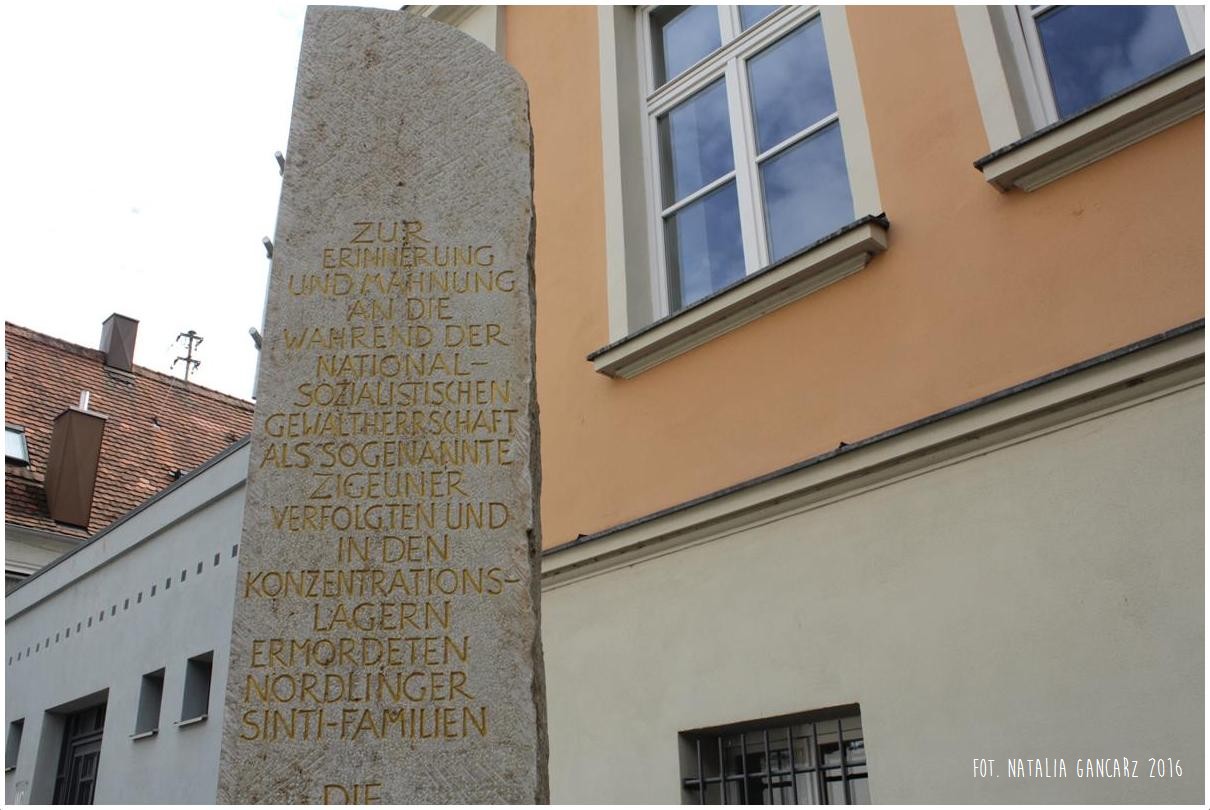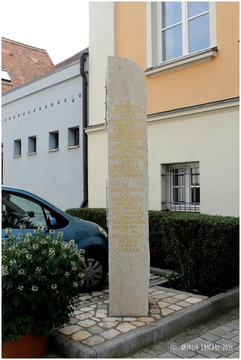 (Na pamiątkę i ku przypomnieniu brutalnego panowania narodowych socjalistów oraz prześladowań i mordów w obozach koncentracyjnych na tzw. Cyganach – rodzinach Sintów z Nördlingen. – Ocaleni z ludobójstwa m.in. z rodzin Reinhardt i Lehmann, którzy po 1945 r. znaleźli w tym mieście nowy dom)