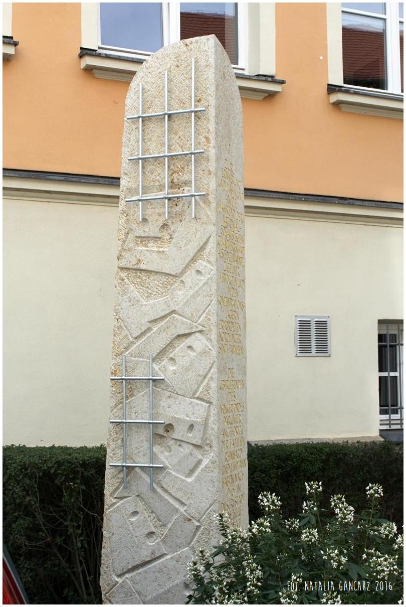 Pomnik – kamienny słup z wygładzonymi dwiema ścianami, a dwiema pozostałymi surowymi, nieobrobionymi. Po prawej stronie znajdują się napisy, a symboliczne przedstawienia postaci ludzkich za kratami – po lewej stronie („cierpienie i okropności holokaustu wobec Sinti i Romów”). Lokalizacja obelisku – po lewej stronie wejścia głównego do biblioteki miejskiej. Symetrycznie po drugiej stronie znajduje się pomnik poświęcony Żydom.