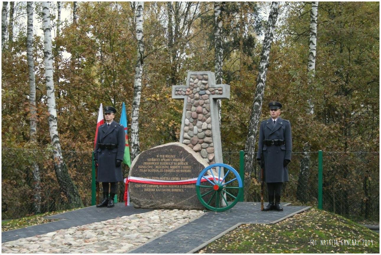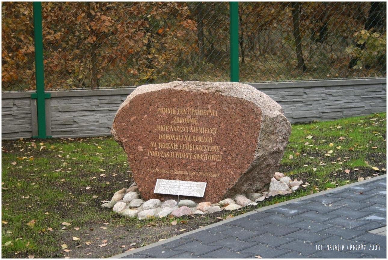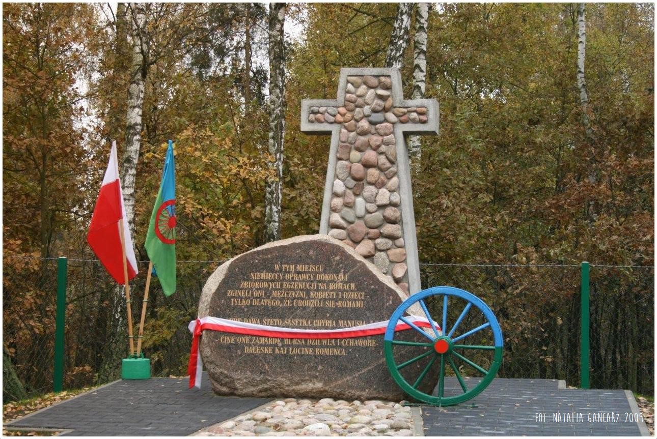 W tym miejscu / hitlerowscy oprawcy dokonali / zbiorowej egzekucji na Romach. / Zginęli oni – mężczyźni kobiety i dzieci / tylko dlatego, że urodzili sie Romami.