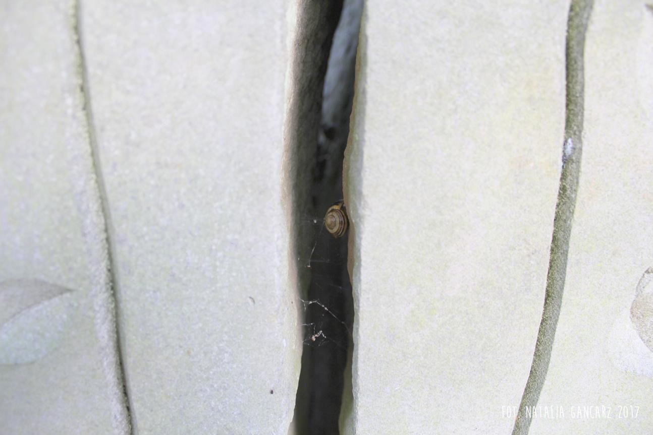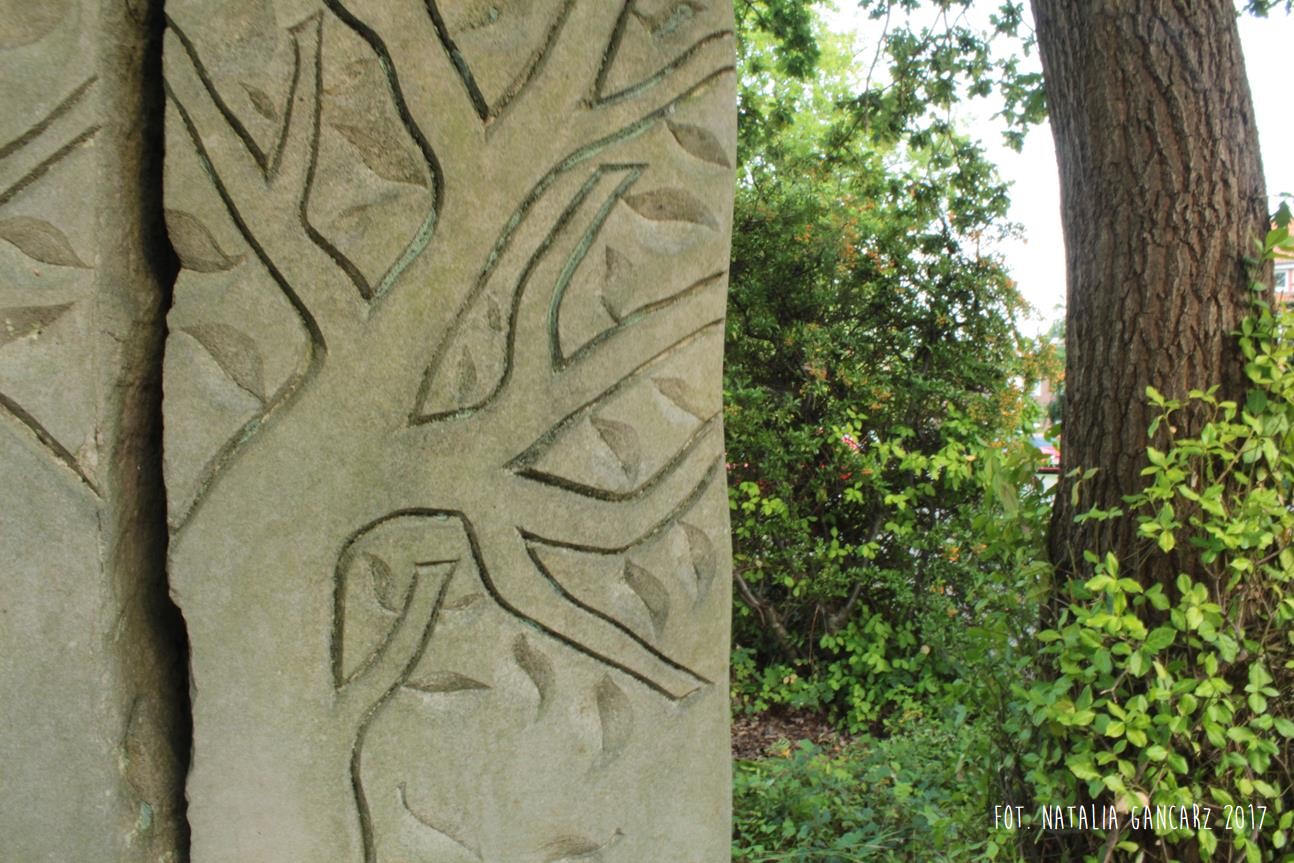 Także szczyt steli, nieidealnie zeszlifowany, jest zaznaczony reliefem gałęzi drzewa – łączących oba boczne reliefy w jedną całość.