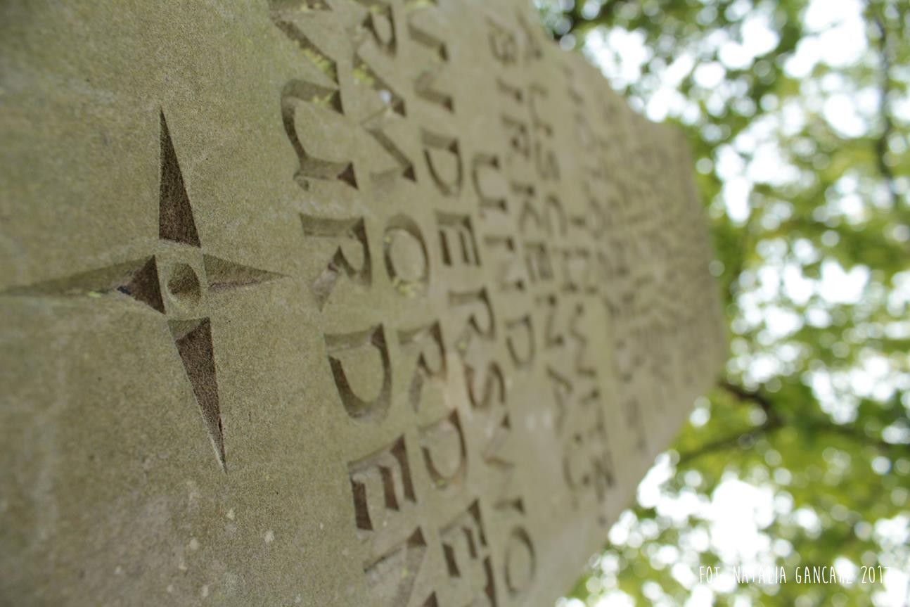 Napis w jęz. niemieckim, cytowany poniżej, podzielony jest na dwie części i wyryty w kamieniu po stronach przeciwległych, a więc na tych ścianach słupa, które nie zostały rozdzielone szczeliną (w tekście niemieckim zaznaczone znakiem „///”).
