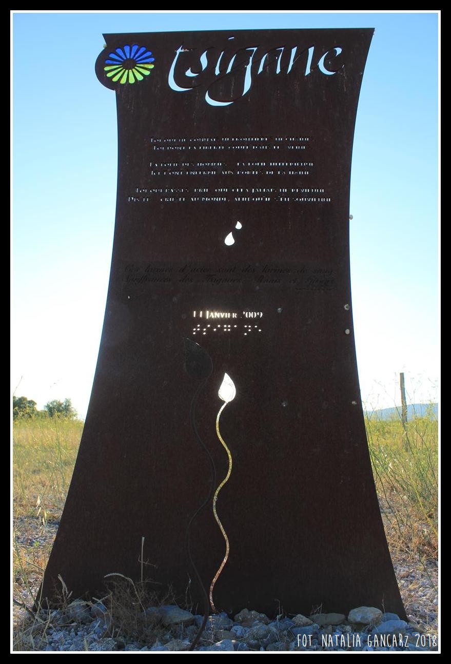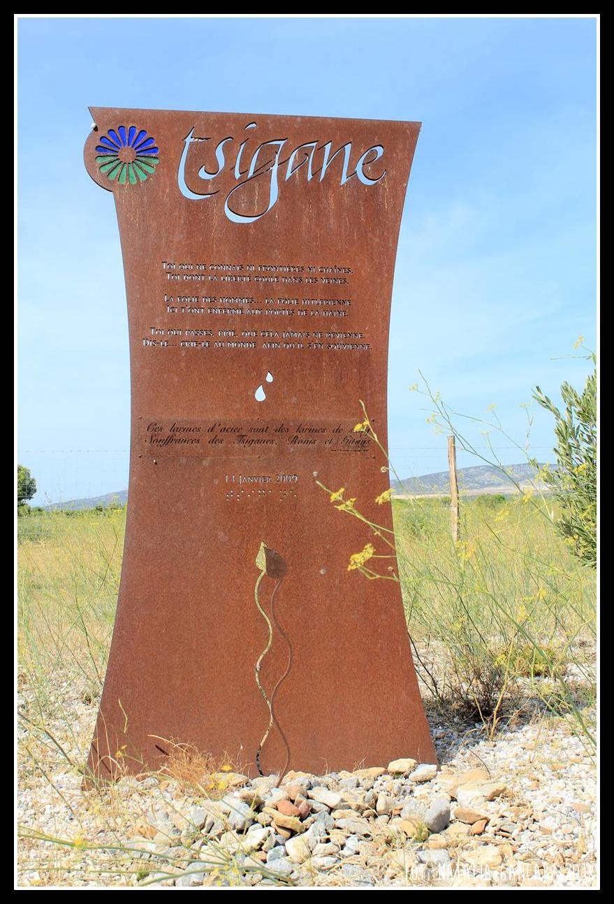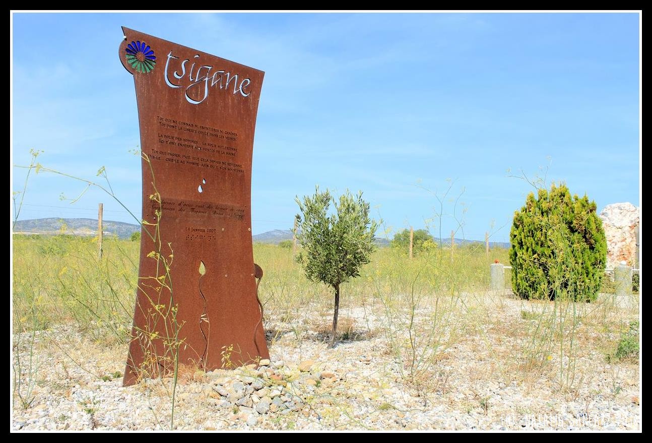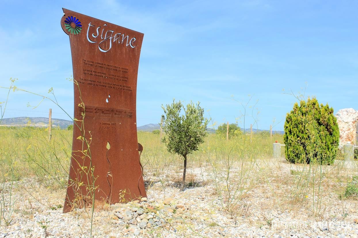 Przy drodze nr D5, w kompleksie pomników, upamiętniających internowanych w obozie Rivesaltes – drugi od lewej poświęcony jest Cyganom.