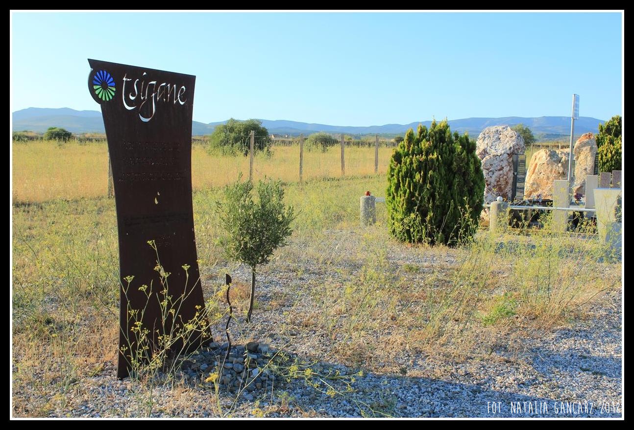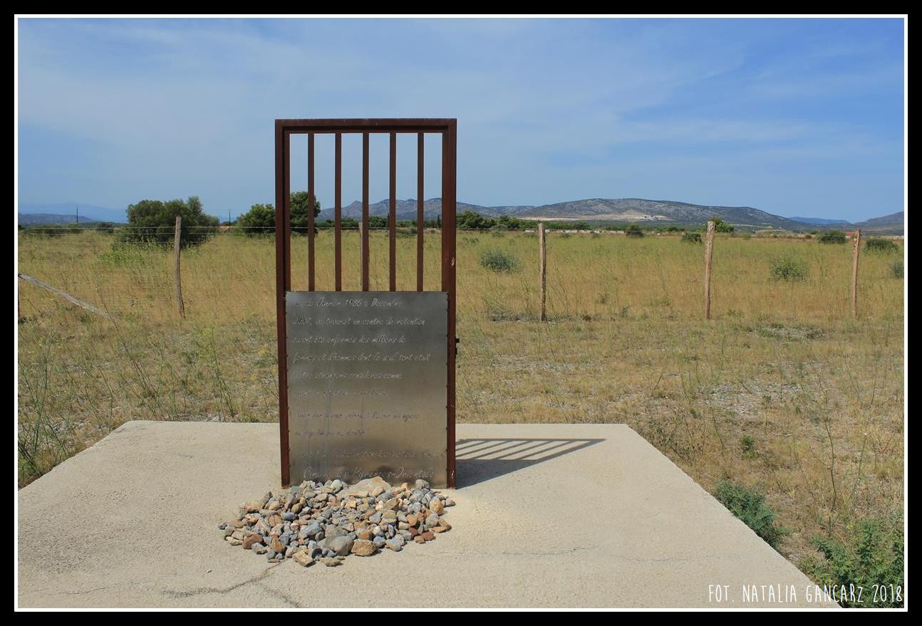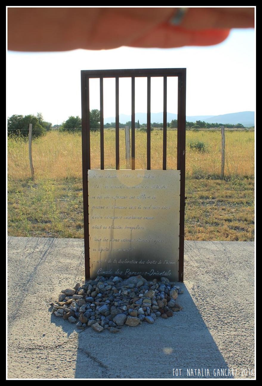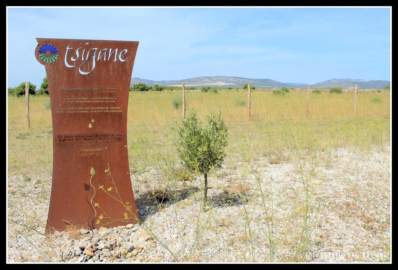 Przy drodze nr D5, w kompleksie pomników, upamiętniających internowanych w obozie Rivesaltes – drugi od lewej poświęcony jest Cyganom.