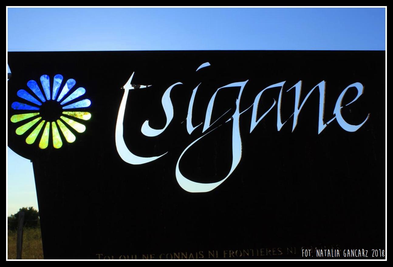 Tablica lekko pochylona do tyłu w kształcie zwężonego prostokąta (w kierunku klepsydry). Napisy wycięte są przez całą grubość blachy kortenowskiej: u góry największy napis „tsigane”, a po jego lewej stronie koło cygańskie w barwach flagi romskiej, składające się z dwóch szyb witrażowych w kolorze niebieskim i zielonym, osadzonych w ramie z blachy. Poniżej napis w języku francuskim, a pod nim dwie wycięte w tablicy krople.