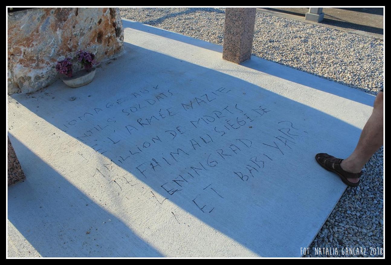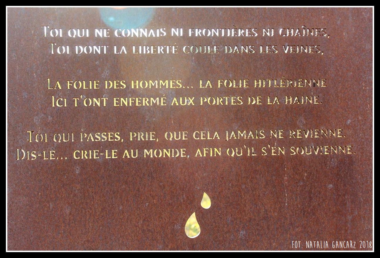 Toi qui ne connais ni frontiéres ni chaînes, / Toi dont la liberté coule dans les veines, // La folie des hommes… la folie hitlérienne / Ici t’ont enfermé aux portes de la haine. // Toi qua passes, prie, que cela jamais ne revienne. / Dis-le… crie-le au monde, afin qu’il s’en souvienne.
