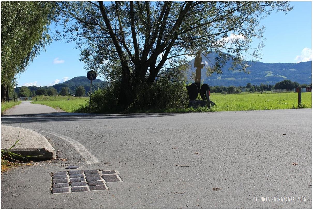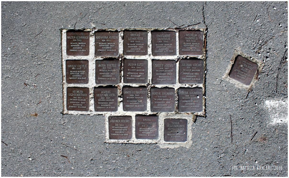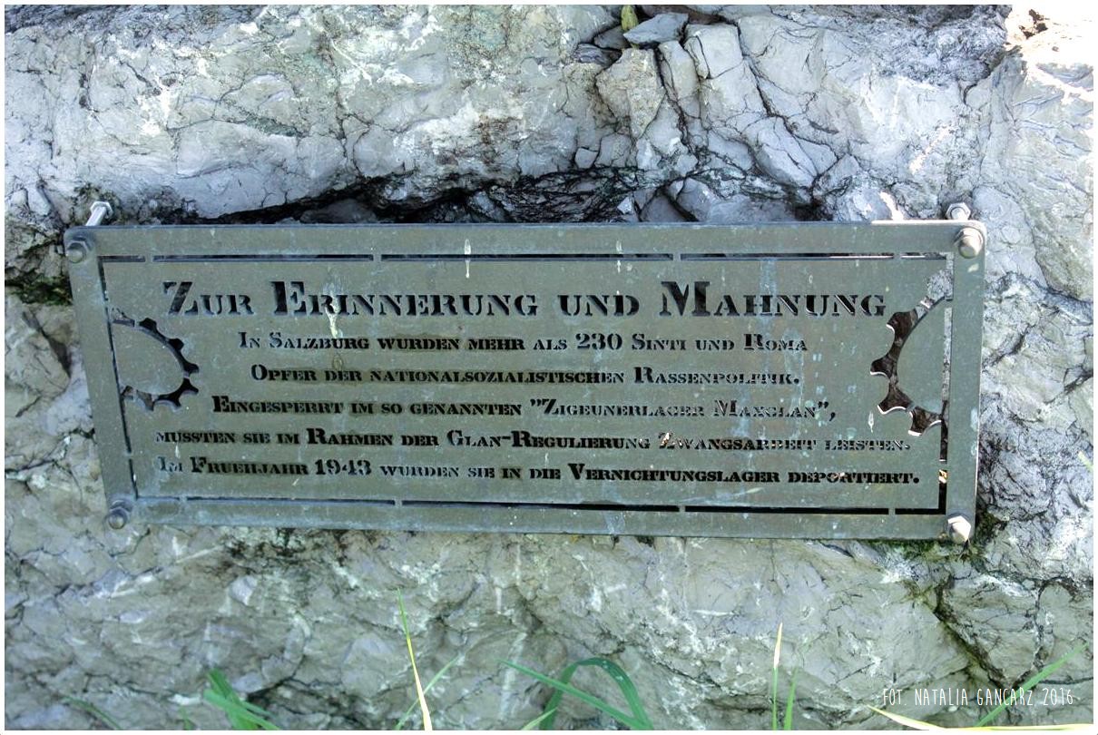 (Dla pamięci i przestrogi. / W Salzburgu było ponad 230 Sintów i Romów / ofiar polityki rasowej narodowego socjalizmu. / Zamknięci w tak zwanym „Obozie cygańskim Maxglan”, / poddani pracy przymusowej w Glan-Regulierung. / Wiosną 1943 zostali wywiezieni do obozów zagłady.)