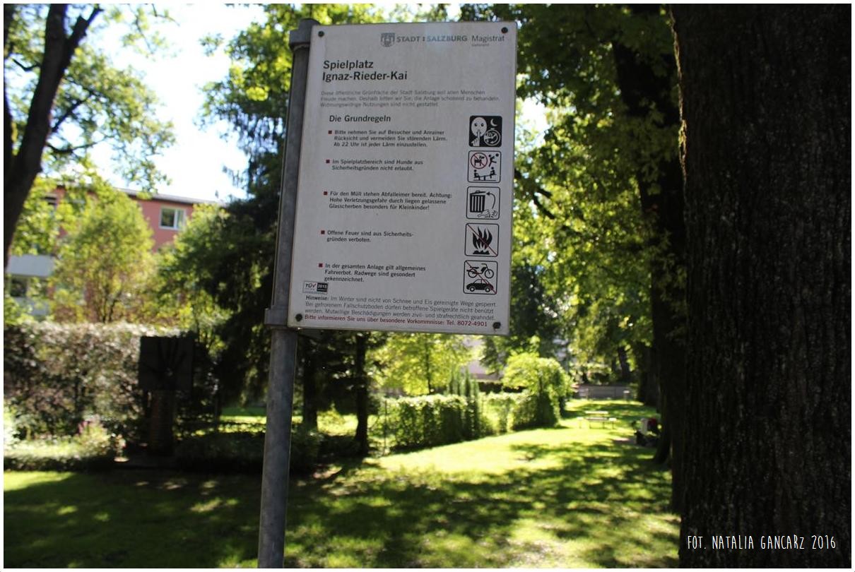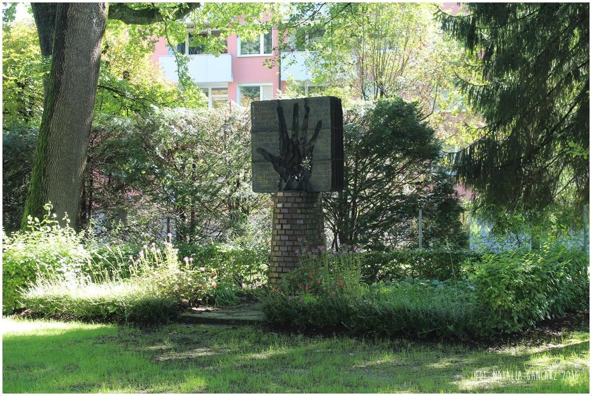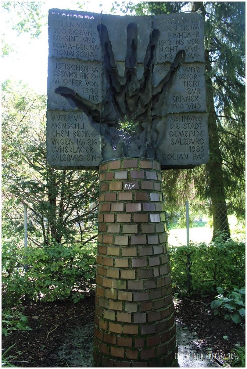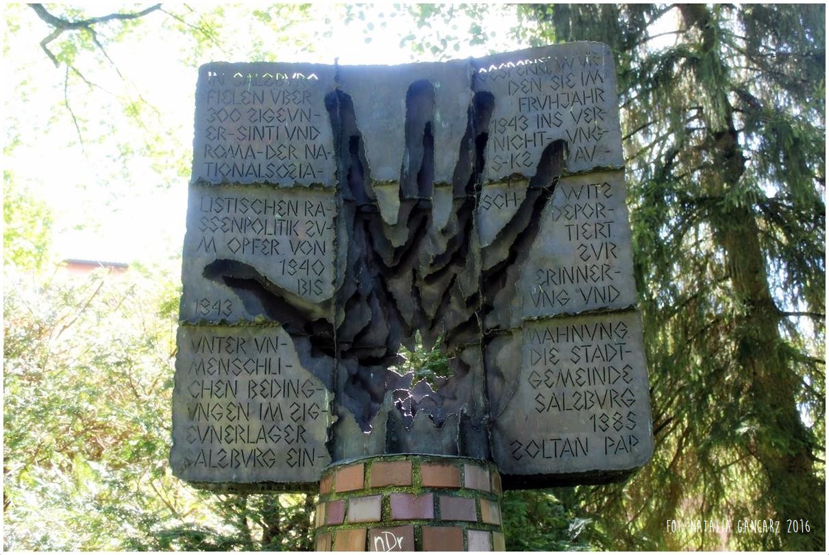 (W Salzburgu poległo ponad 300 Cyganów – Sintów i Romów – ofiar narodowo socjalistycznej polityki rasowej. Od 1940 do 1943 byli przetrzymywani w nieludzkich warunkach w obozie cygańskim w Salzburgu, a wiosną 1943 zostali deportowani do obozu zagłady Auschwitz. Dla pamięci i przestrogi. Społeczność miasta Salzburg. 1985 – Zoltan Pap)