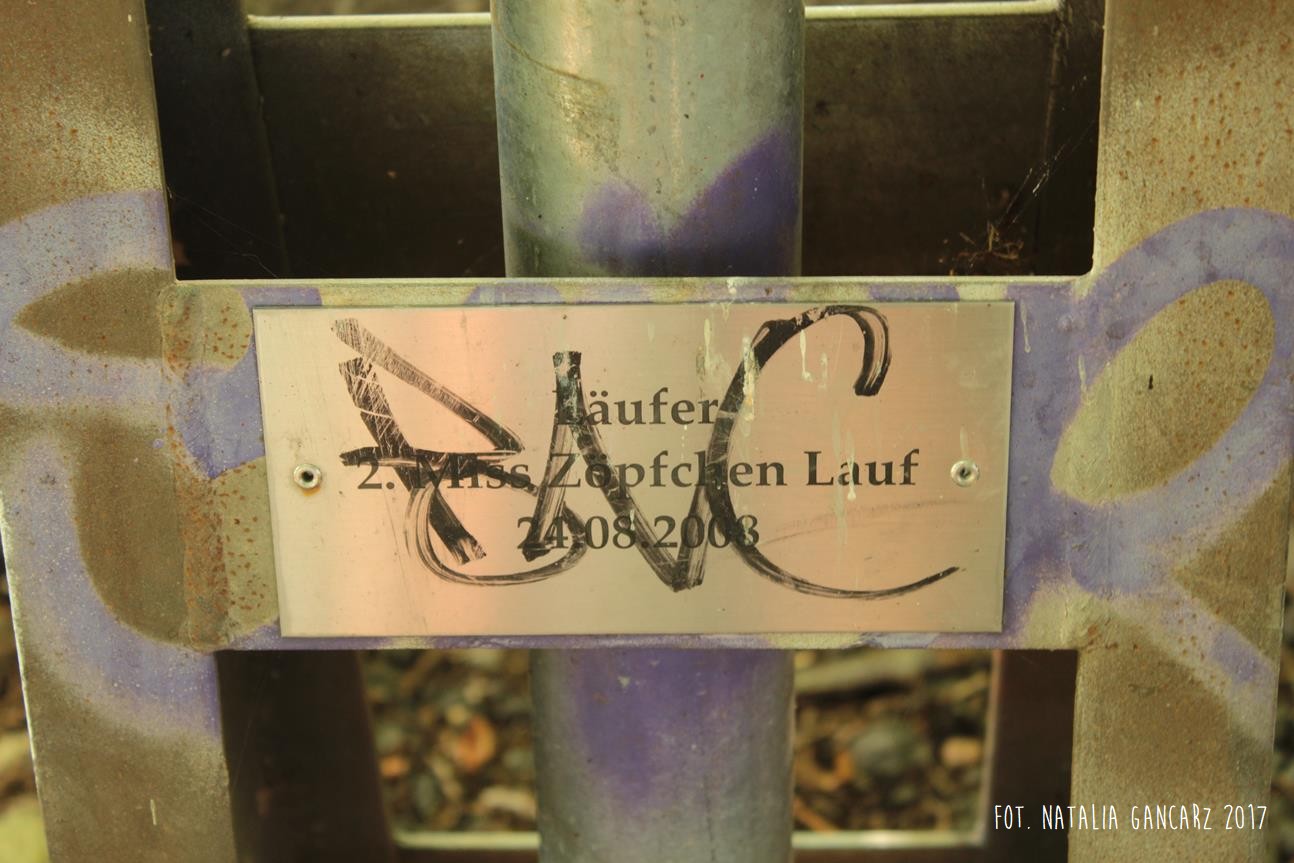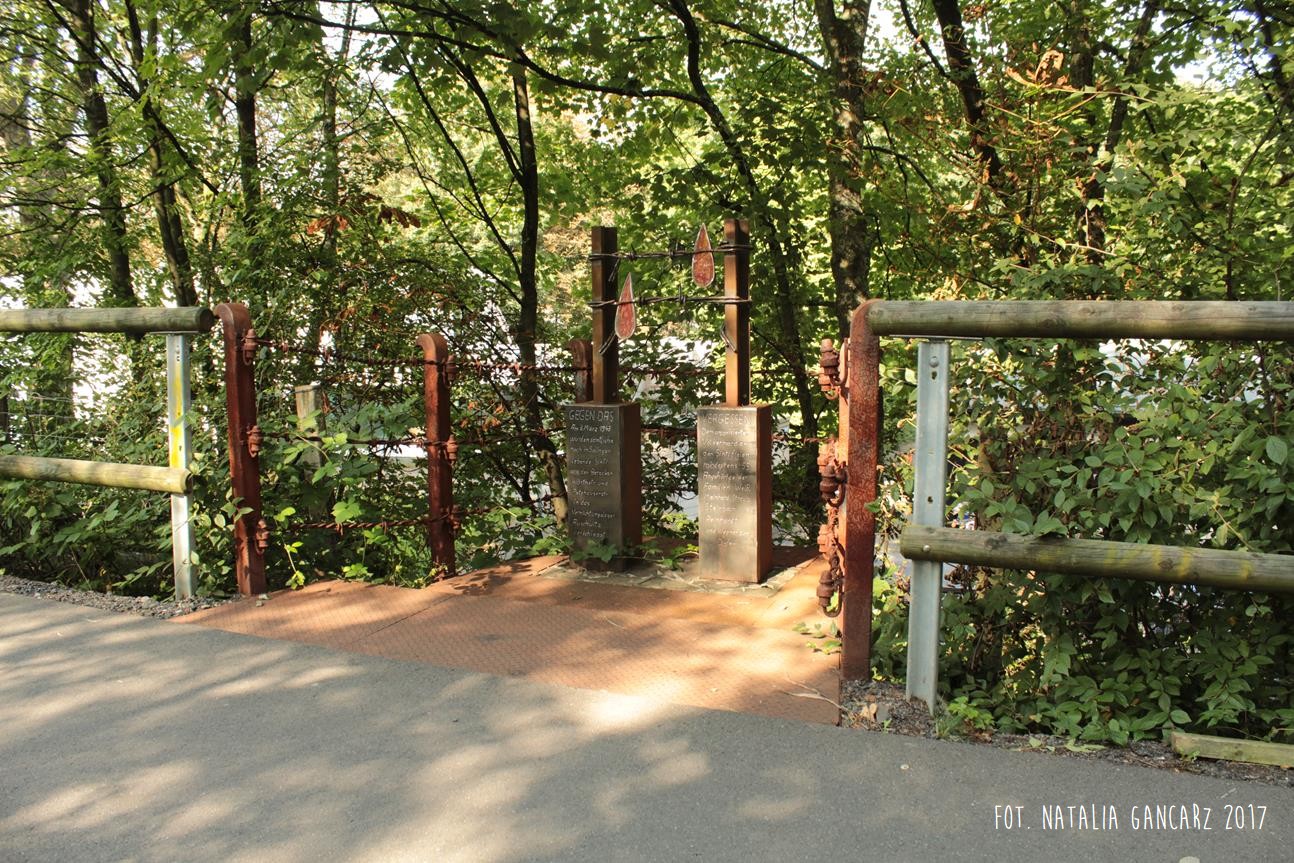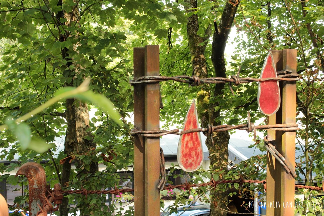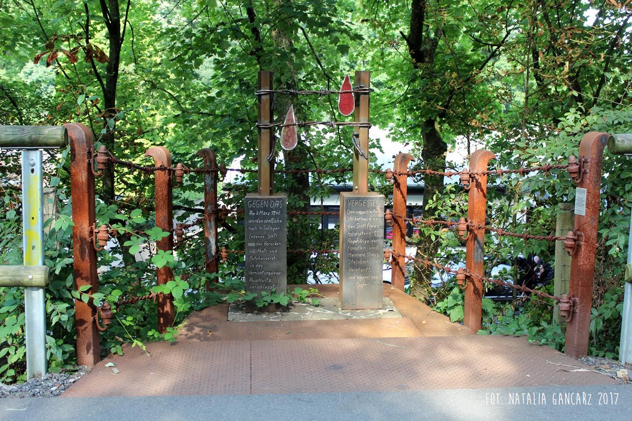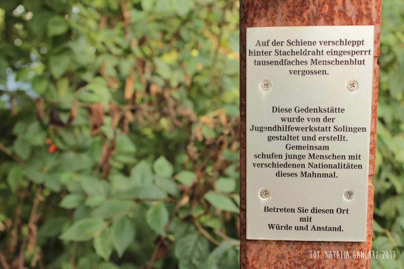 Uwięziony za drutem kolczastym i szyną, przelewający wiele ludzkiej krwi… Ten pomnik został zaprojektowany i wykonany przez Młodzież z „Ochotniczego Hufca Pracy” w Solingen. Młodzież różnych narodowości – razem – stworzyła ten pomnik. Wejdź w to miejsce z godnością i przyzwoitością.