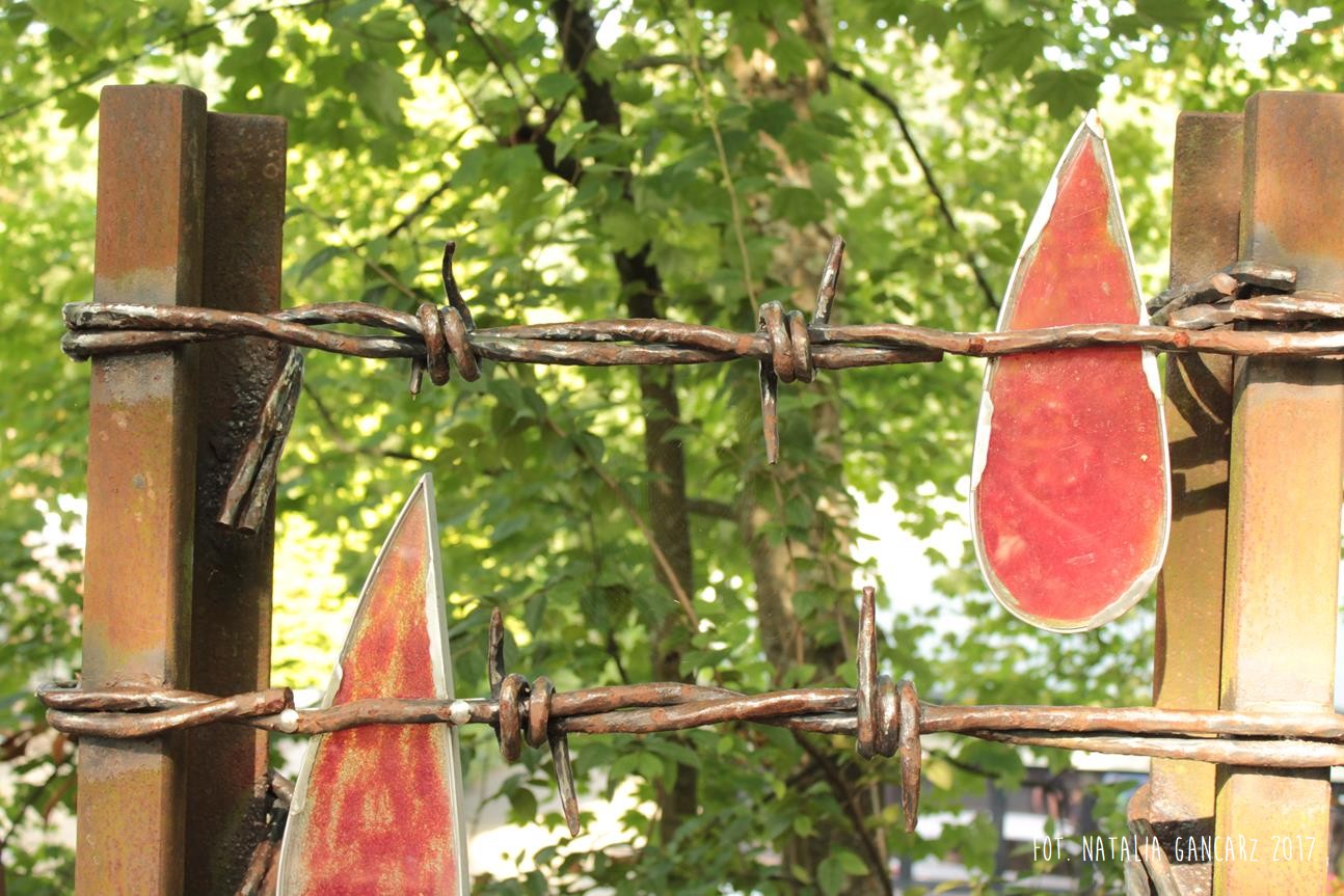 Przybrał on bardzo ciekawą formę. Niezbyt widoczny ze ścieżki rowerowej, jednak oddzielony od niej rodzajem podestu, pokrytym skorodowaną blachą ryflowaną. Sam pomnik ma wysokość ponad 2 m. Składa się z dwóch steli, tj. wmurowanych w cokół fragmentów szyn kolejowych. Szyny połączone są instalacją ze stali, zwiniętej na kształt drutu kolczastego, spomiędzy którego wypływają krople krwi. Krew – to barwione na czerwono szkło, w kształcie kropli, osadzone w ołowiu.