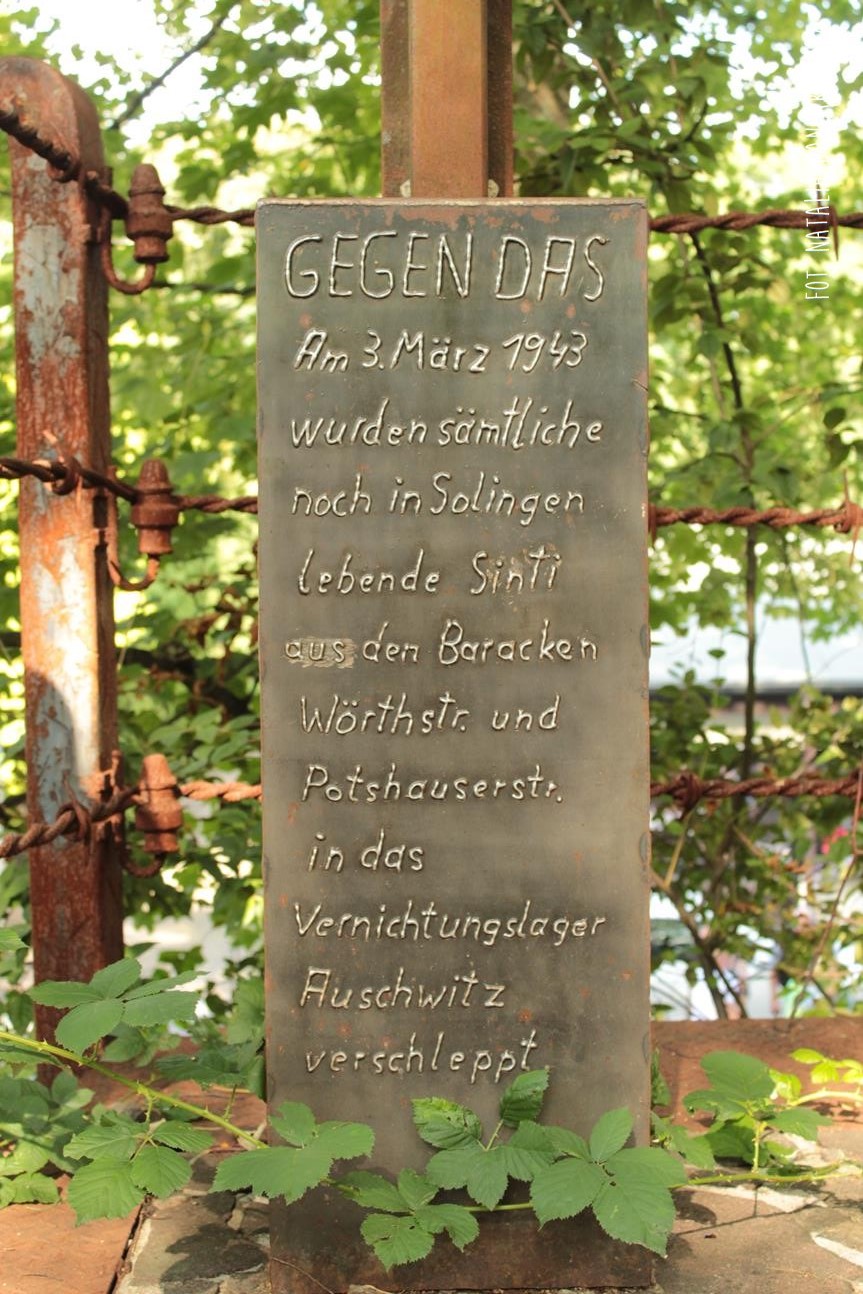 GEGEN DAS / Am 3 März 1943 / wurden sämtliche / noch in Solingen / lebende Sinti / aus den Baracken / Wörthstr. und / Potshauserstr. / in das / Vernichtungslager / Auschwitz / verschleppt.
