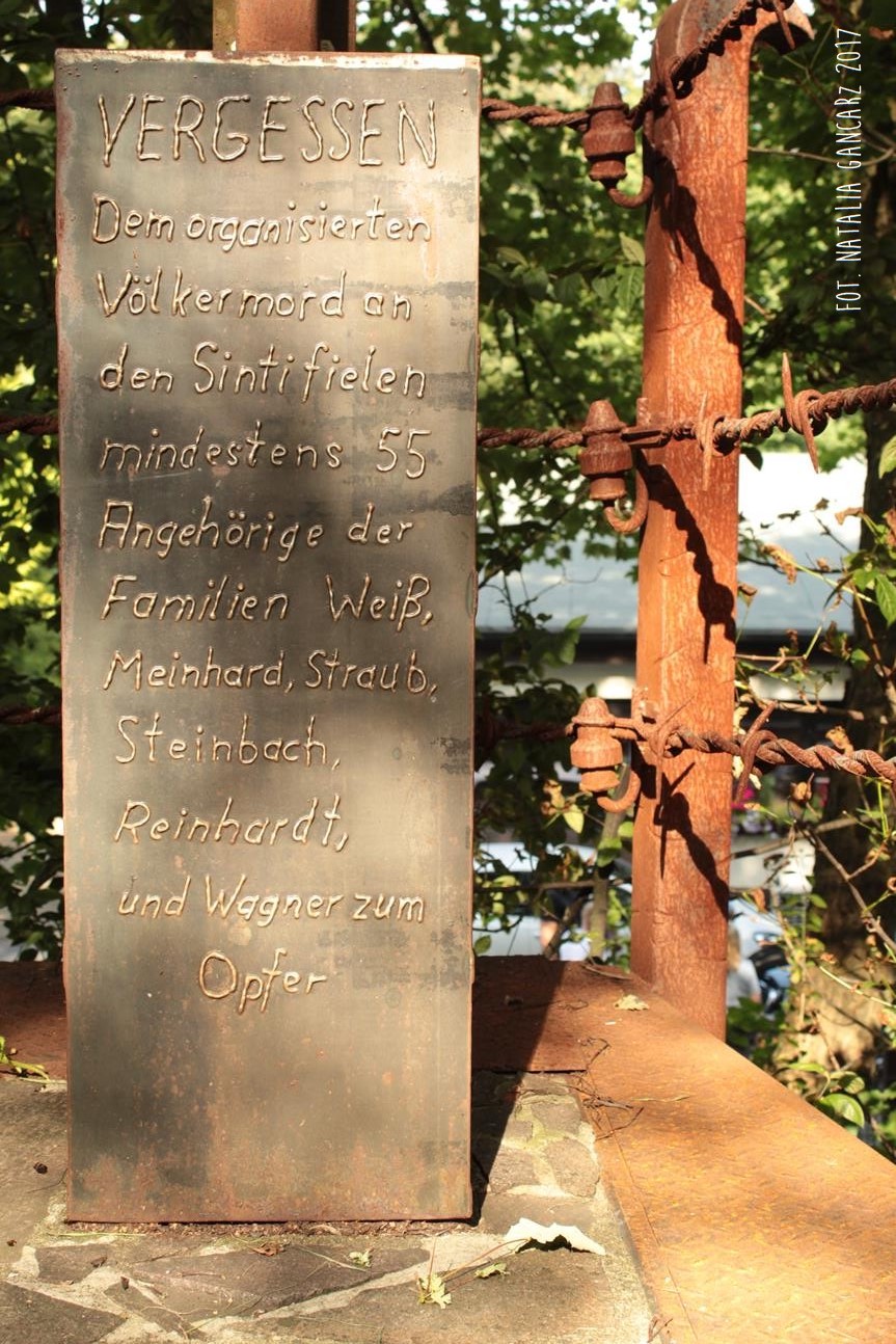 VERGESSEN / Der organisierten / Völkenmord an / den Sinti fielen / mindetens 55 / Angehörige der / Familien Weiß, / Meinhardt, Straub, / Steinbach, Reinchardt, / und Wagner zum, / Opfer.