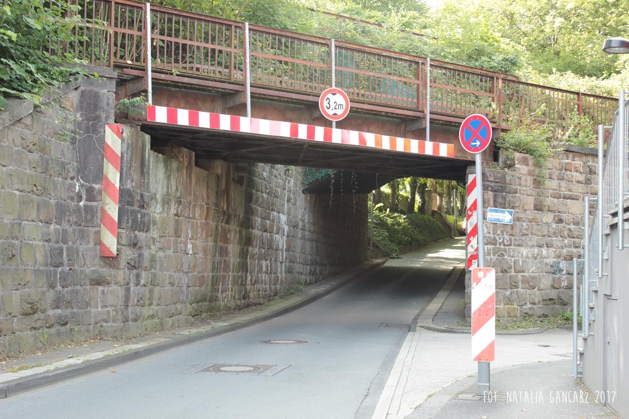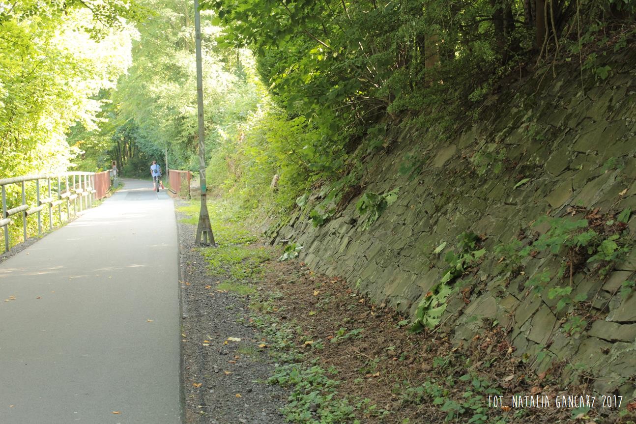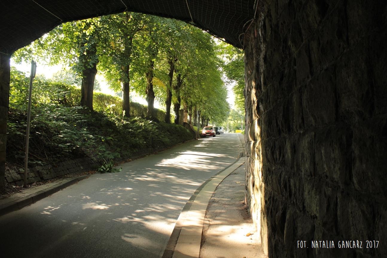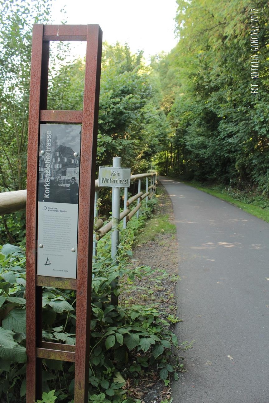 Obwodnica rowerowa Korkenziehertstrasse (dawna kolej) pomiędzy przebiegającymi pod spodem ulicami Klaubergerstrasse (stąd można wejść na górę i kierować się obwodnicą w stronę Cronenbergerstrasse)