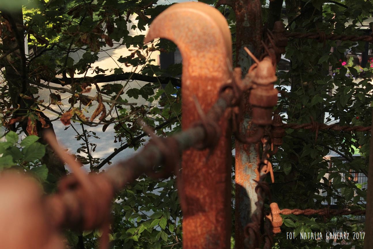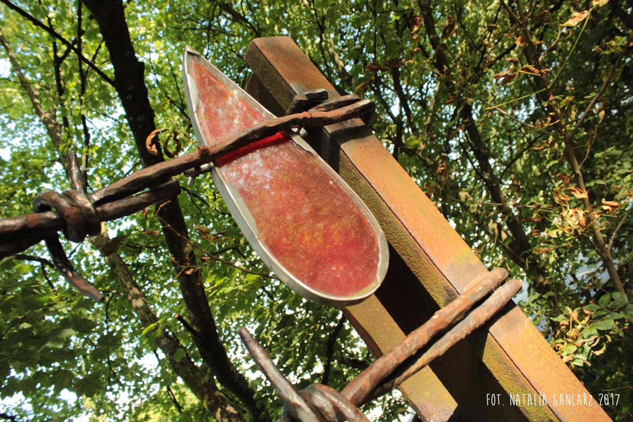 Ciekawa jest także forma ogrodzenia miejsca pamięci. Składa się na nie 6 słupów stalowych, wykutych na kształt słupów betonowych pod prądem, charakterystycznych dla ogrodzeń obozów koncentracyjnych – w tym wypadku również łączy je 3 rzędy drutu kolczastego, ale „bezpieczniki” wykute są również ze stali.