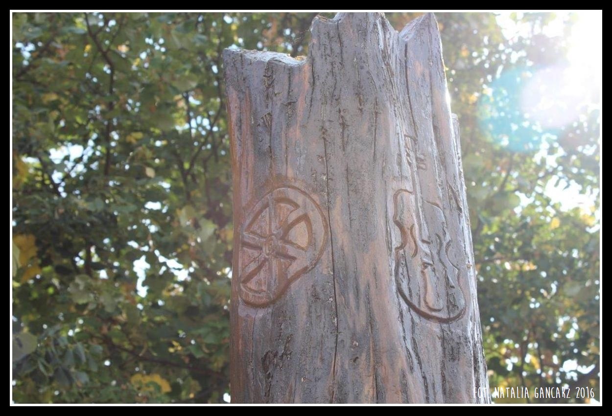 Okrągły drewniany słup z wyciętymi symbolami koła, skrzypiec, kotła (?) i podkowy oraz napisem. Słup umocowany jest szpilkami do betonowego podłoża i umieszczony w wydzielonym z niewielkiej skarpy terenie. Bezpośrednie otoczenie pomnika wyłożone było płytkami, które w 2016 r. w dużej mierze odpadły. Dodatkowo na części betonowej, na miejscu brakujących płytek napis farbą w sprayu.