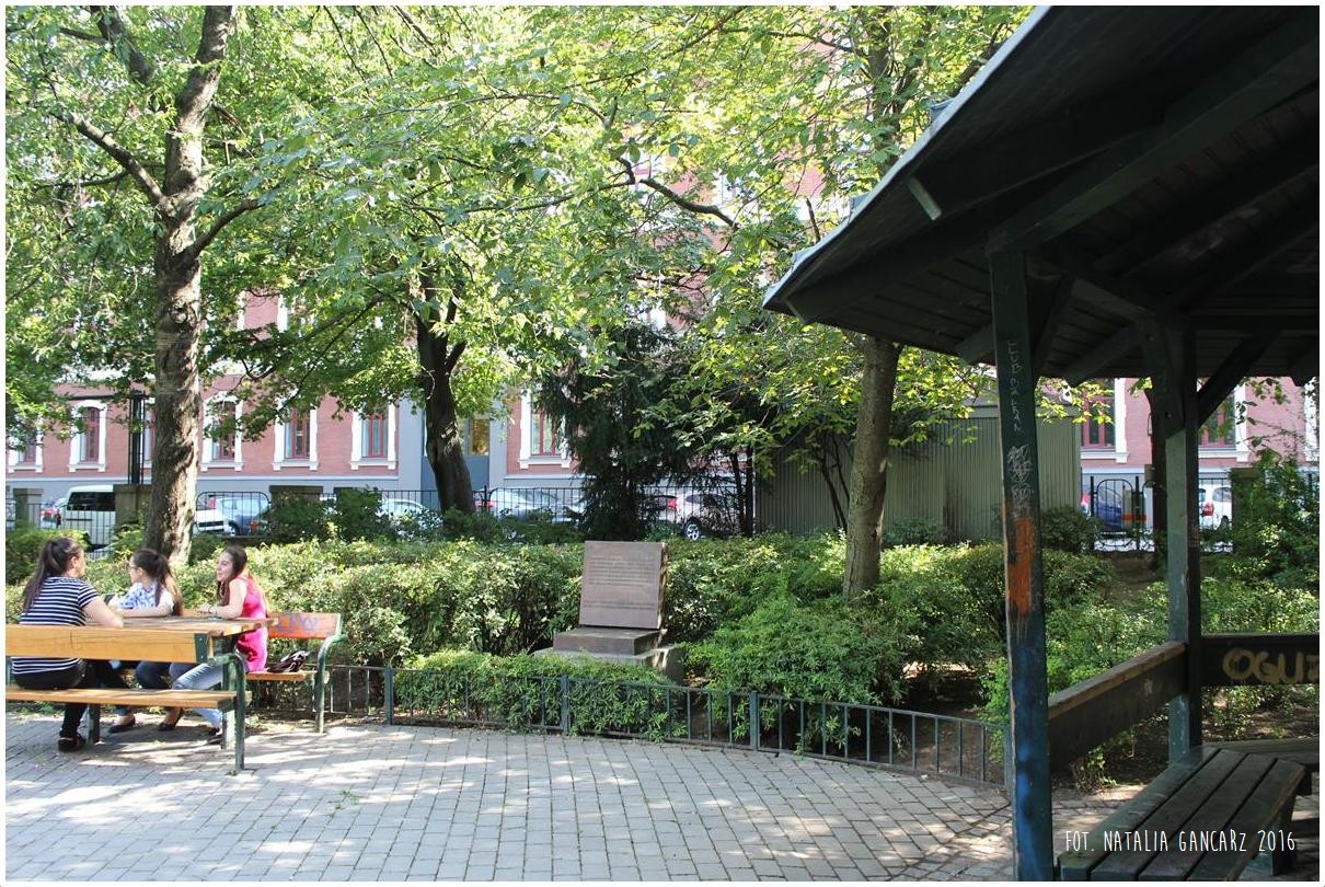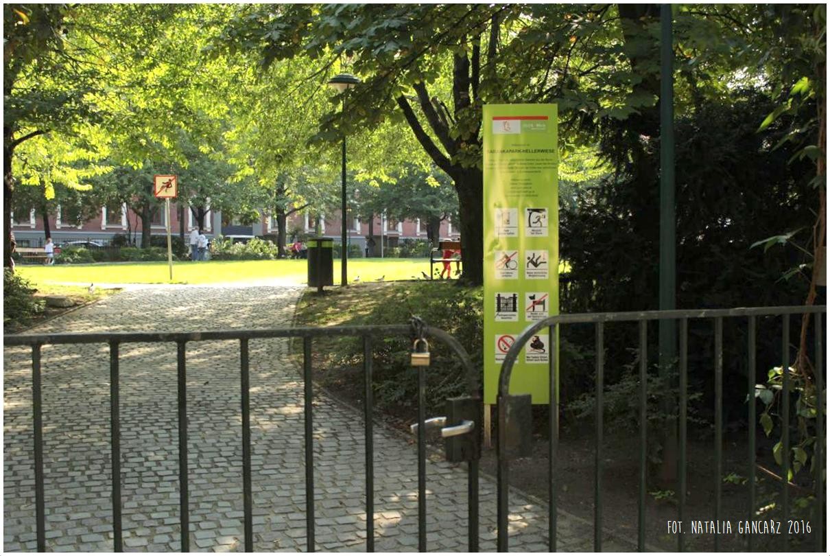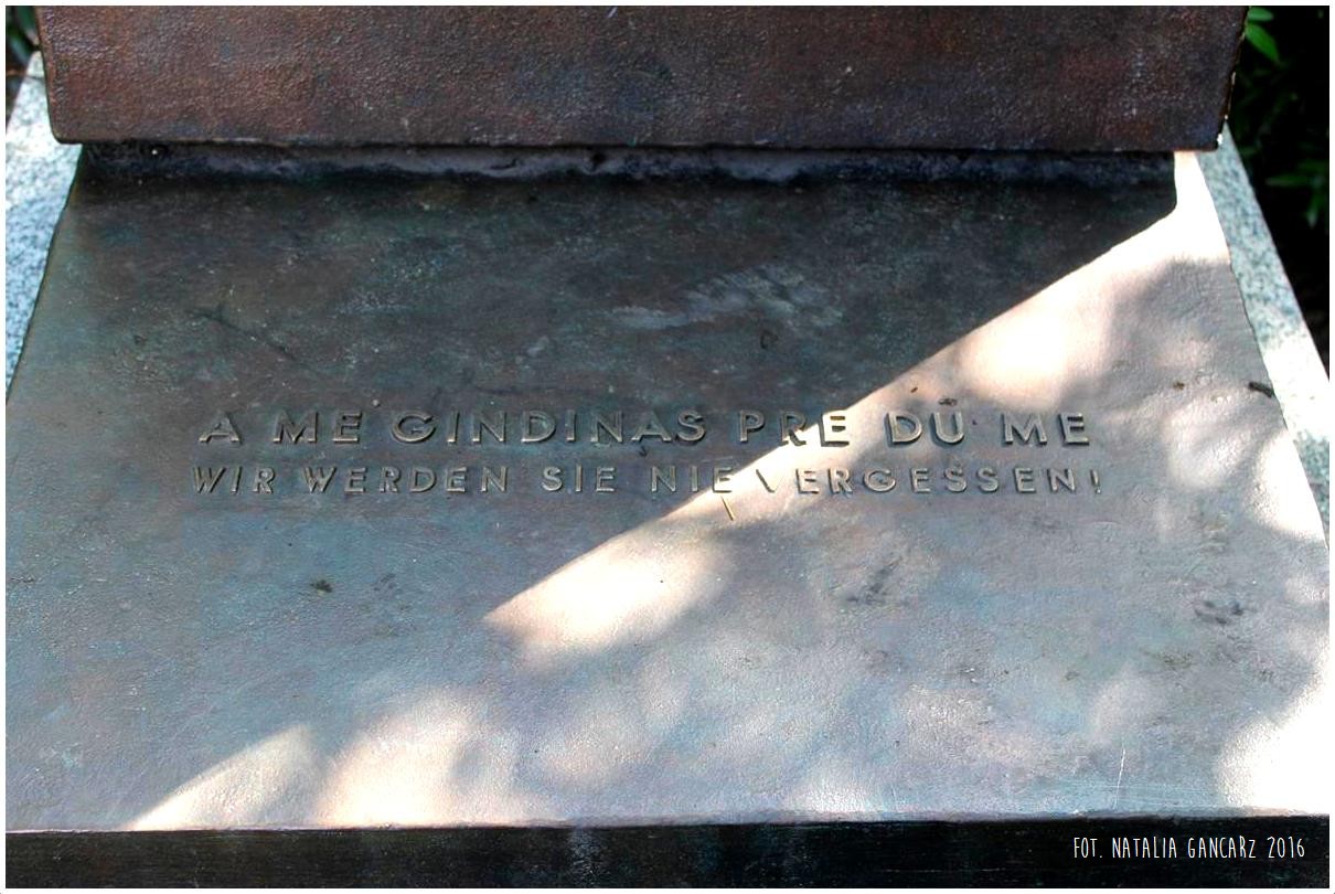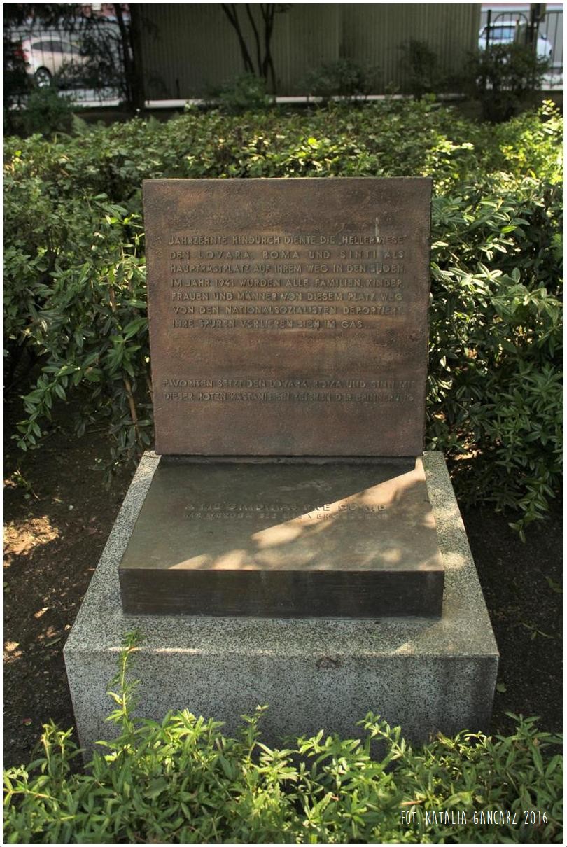 (Łąki Heller służyły przez wiele lat jako miejsce postoju dla Lowarów, Romów i Sintów, podczas ich podróży na południe. W roku 1941 całe rodziny, dzieci, kobiety i mężczyźni, zostały deportowane przez narodowych socjalistów. Kres ich wędrówek był w komorze gazowej. Jako znak pamięci o Lowarach, Romach i Sinti stoi ten czerwony kasztan. A me gindinas pre du me (low.). Nigdy nie zapomnę!)
