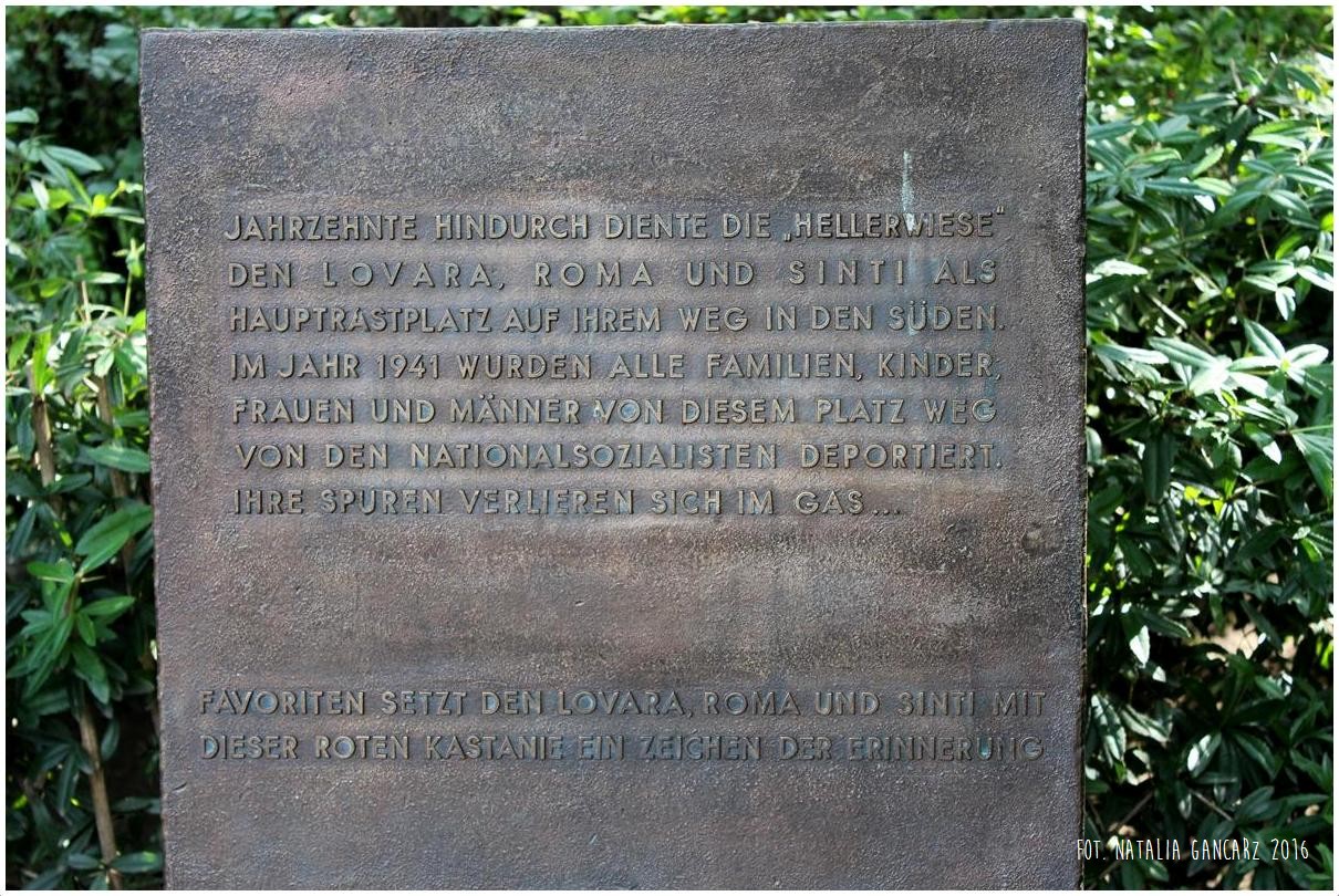 Aktualna tablica, od 2005: „Jahrzehnte hindurch diente die „Hellerwiese” / den Lovara, Roma und Sinti als / hauptrastplatz auf ihrem weg in den süden. / Im jahr 1941 wurden alle familien, Kinder, / Frauen und Männer von diesem Platz weg / von den nationalsozialisten deportiert. / Ihre spuren verlieren sich im gas… // Favoriten setzt den Lovara, Roma und Sinti mit / dieser roten kastanie ein zeichen der erinnerung // A ME GINDINAS PRE DU ME. / Wir werden sie nie vergessen!