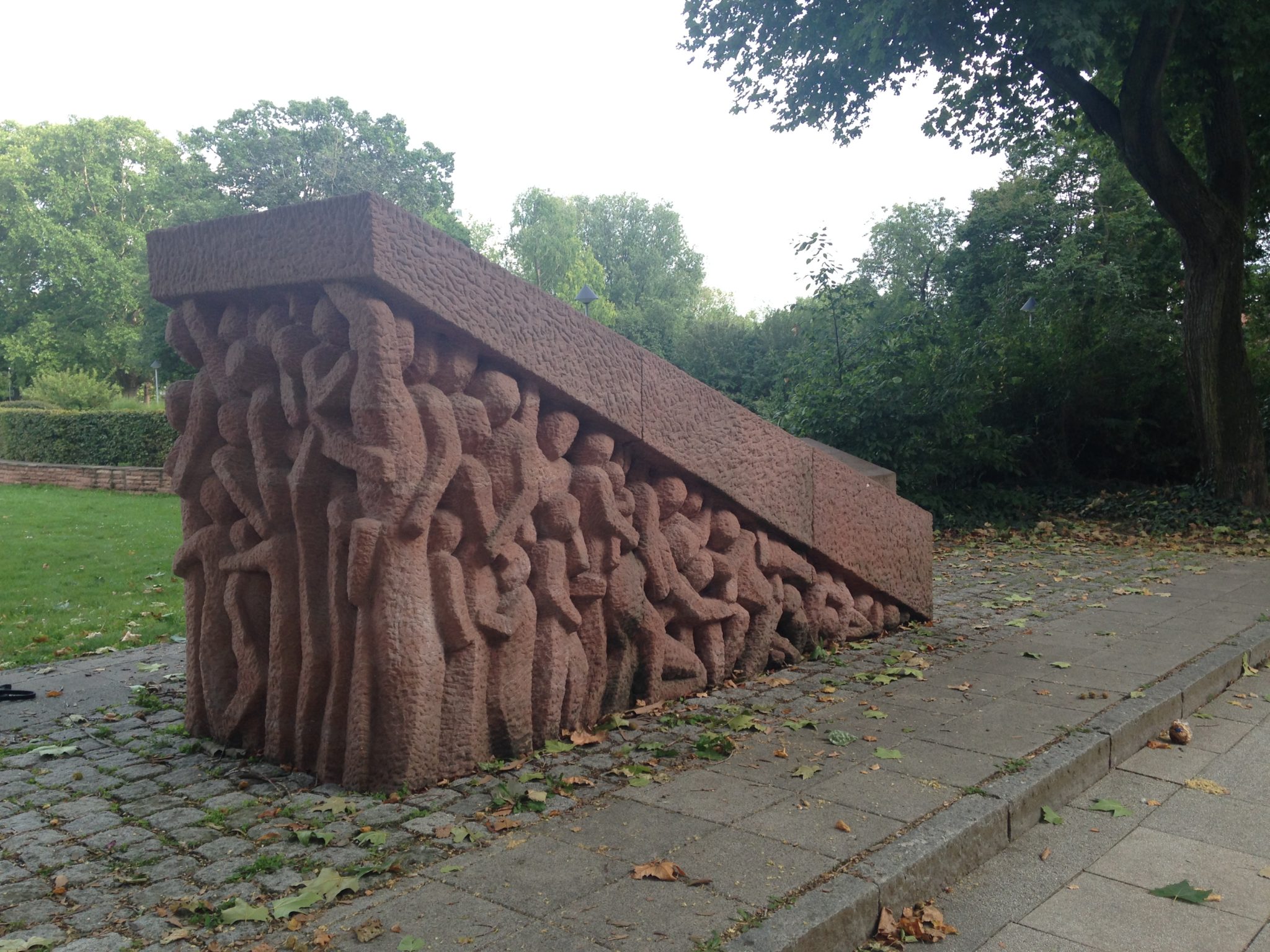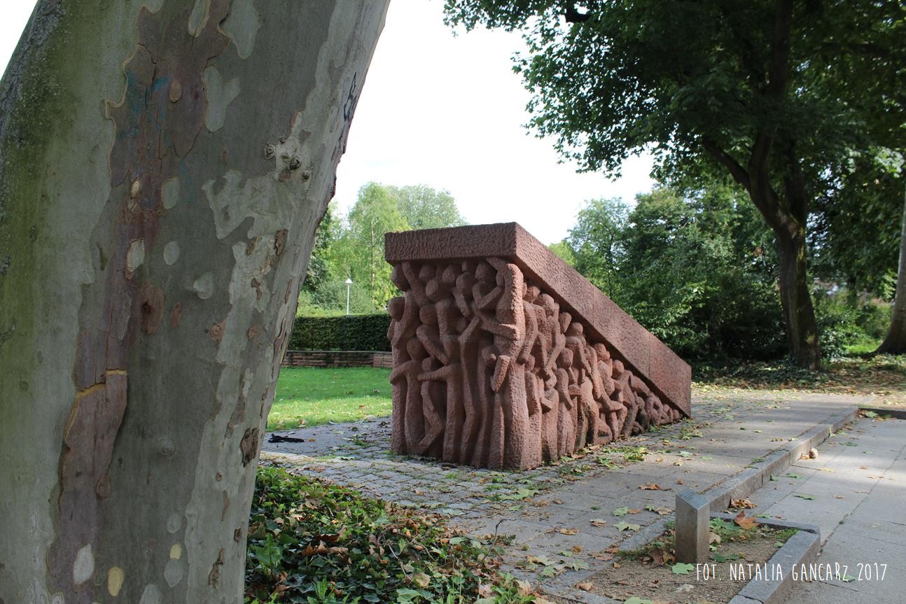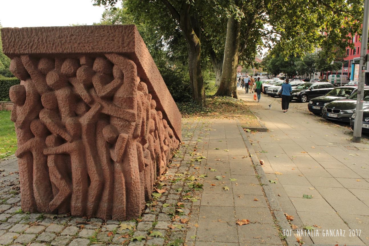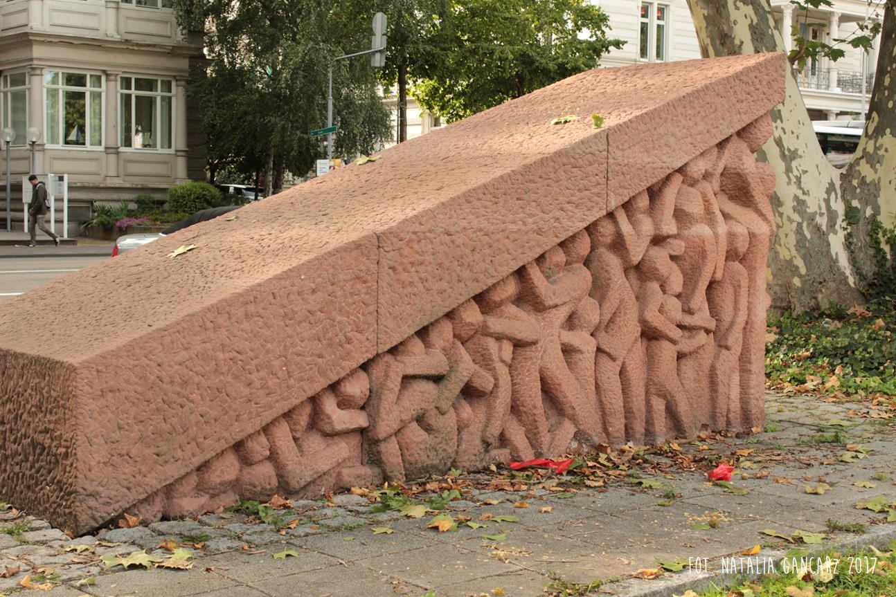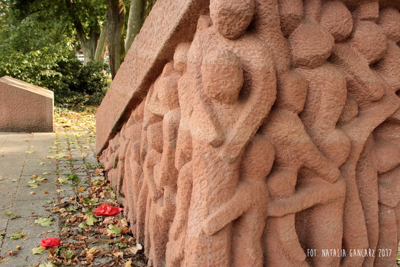 Pochylnia sprawia jednocześnie wrażenie ciężkiej kamiennej płyty, którą usiłują unieść postaci Romów i Sinti – reliefów po obu bokach pomnika. Płyta jednak okazuje się dla nich zbyt ciężka – i miażdżąca.