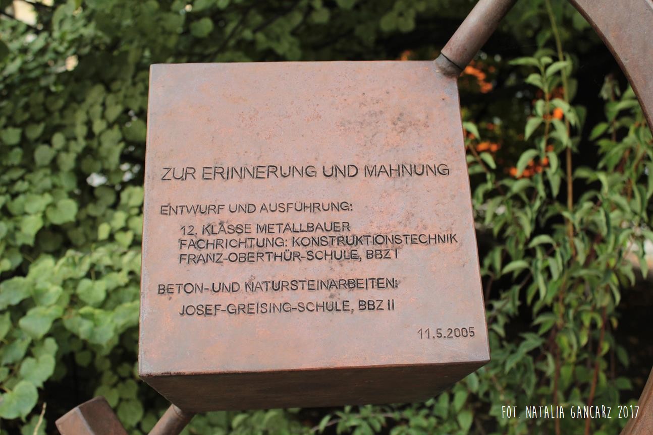 ‘Dla pamięci i przypomnienia: / projekt i wykonanie: / klasa 12. Pracowników w metalu, kierunek: technika budowlana, Szkoła im. Franza Oberthüra / Beton i architektura ogrodnicza: Szkoła im. Josefa Greisinga. / 11.05.2005’