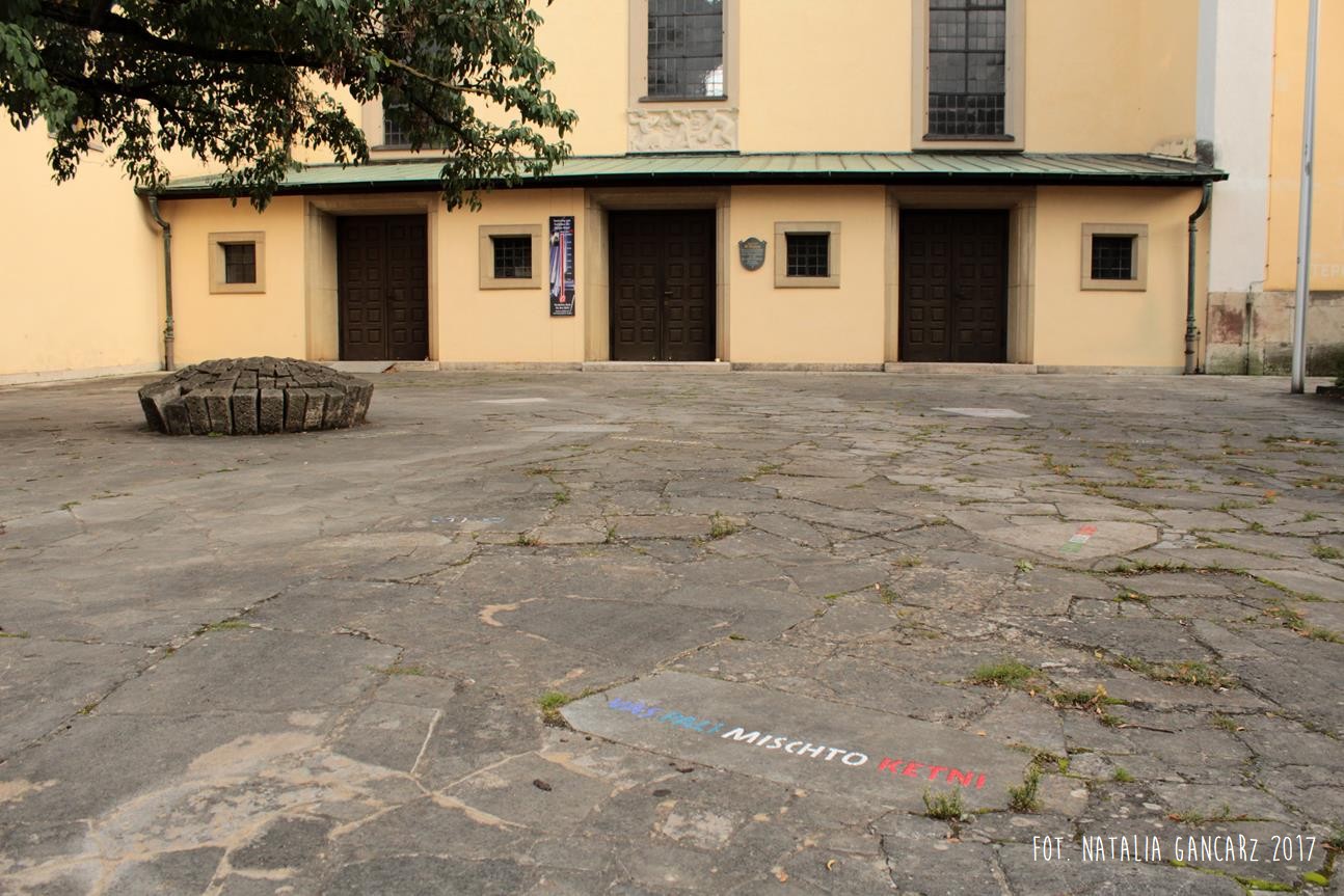 Częścią instalacji jest półkula, osadzona bezpośrednio na kamiennych płytach chodnikowych placu kościelnego, składająca się z odpowiedniej wysokości kostek granitowych, przypominająca kamienny kwiat. Kamienie zostały pocięte w czasie wojny i miały posłużyć Niemcom do budowy obiektów, potrzebnych systemowi. Kwiat, który z nich zbudowano ma posłużyć przebudowaniu świadomości historycznej. Na tablicy informacyjnej powiedziane jest wręcz, że „wyszło to na jaw, bowiem wina za przeszłość wymaga konfrontacji”.