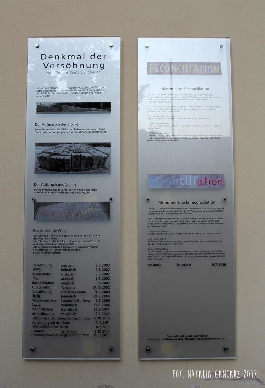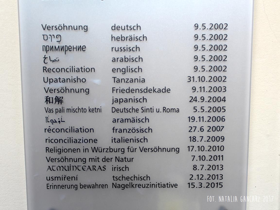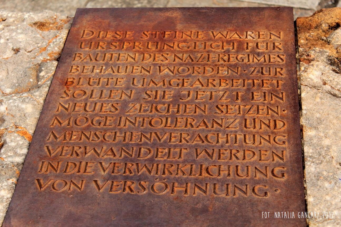 DIESE STEINE WAREN / URSPRÜNGLICH FÜR / BAUTEN DES NAZI-REGIMES / BEHAUEN WORDEN. ZUR / BLÜTE UMGEARBEITET / SOLLEN SIE JETZT EIN / NEUES ZEICHEN SETZEN. / MÖGEINTOLERANZ UND / MENSCHENVERACHTUNG / VERWANDELT WERDEN / IN DIE VERWIRKLICHUNG / VON VERSÖHNUNG.